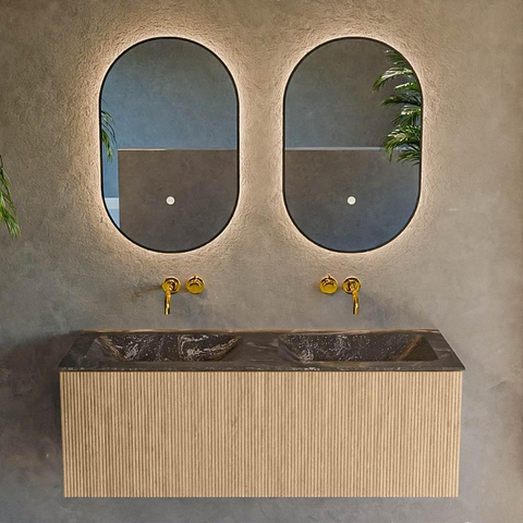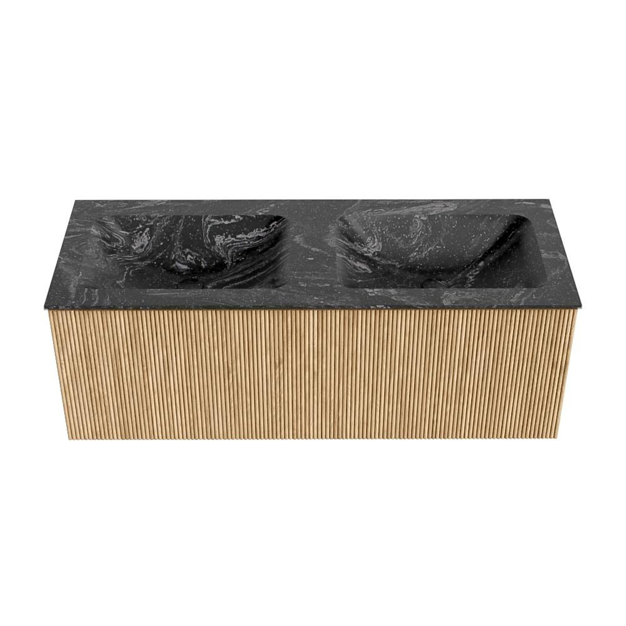 MONDIAZ KURVE-DLUX 120cm badmeubel kleur Oak met 1 lade. Wastafel LEAF dubbel zonder kraangat kleur Lava.