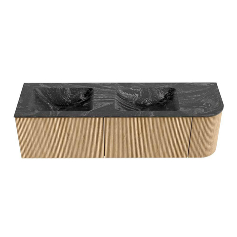MONDIAZ KURVE-DLUX 155cm badmeubel met module 25 R kleur Oak met 2 lades en 1 deur. Wastafel LEAF dubbel / links zonder kraangat kleur Lava.