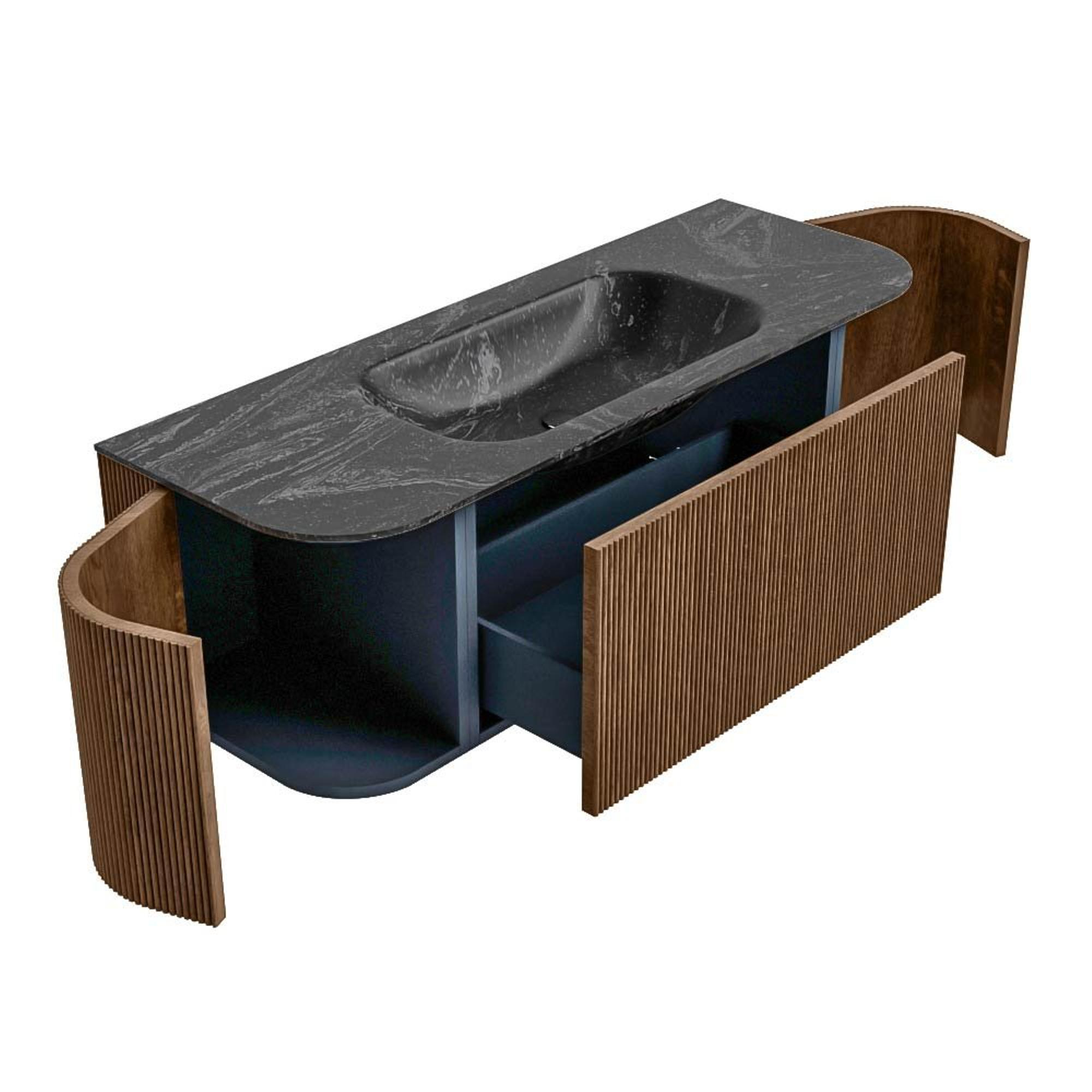 Het ultieme badmeubel dat je badkamer transformeert tot een oase van verfijning. Met zijn halfronde, verticale stroken van massief eiken, verkrijgbaar in de kleuren Oak en Walnut, straalt KURVE vakmanschap uit in elk detail. De zachte rondingen en slim ontworpen deurtjes, elk 40cm hoog, nodigen uit tot gebruik, terwijl de ruimte binnenin optimaal benut wordt dankzij de royale lade van dezelfde hoogte.