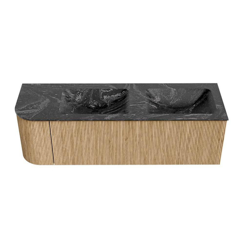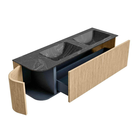 MONDIAZ KURVE-DLUX 145cm badmeubel met module 25 L kleur Oak met 1 lade en 1 deur. Wastafel LEAF dubbel / rechts 2 kraangaten kleur Lava.