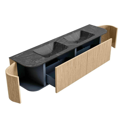 Het ultieme badmeubel dat je badkamer transformeert tot een oase van verfijning. Met zijn halfronde, verticale stroken van massief eiken, verkrijgbaar in de kleuren Oak en Walnut, straalt KURVE vakmanschap uit in elk detail. De zachte rondingen en slim ontworpen deurtjes, elk 40cm hoog, nodigen uit tot gebruik, terwijl de ruimte binnenin optimaal benut wordt dankzij de royale lade van dezelfde hoogte.