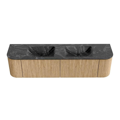 MONDIAZ KURVE-DLUX 180cm badmeubel met module 25 Len R kleur Oak met 2 lades en 2 deuren. Wastafel LEAF dubbel 2 kraangaten kleur Lava.