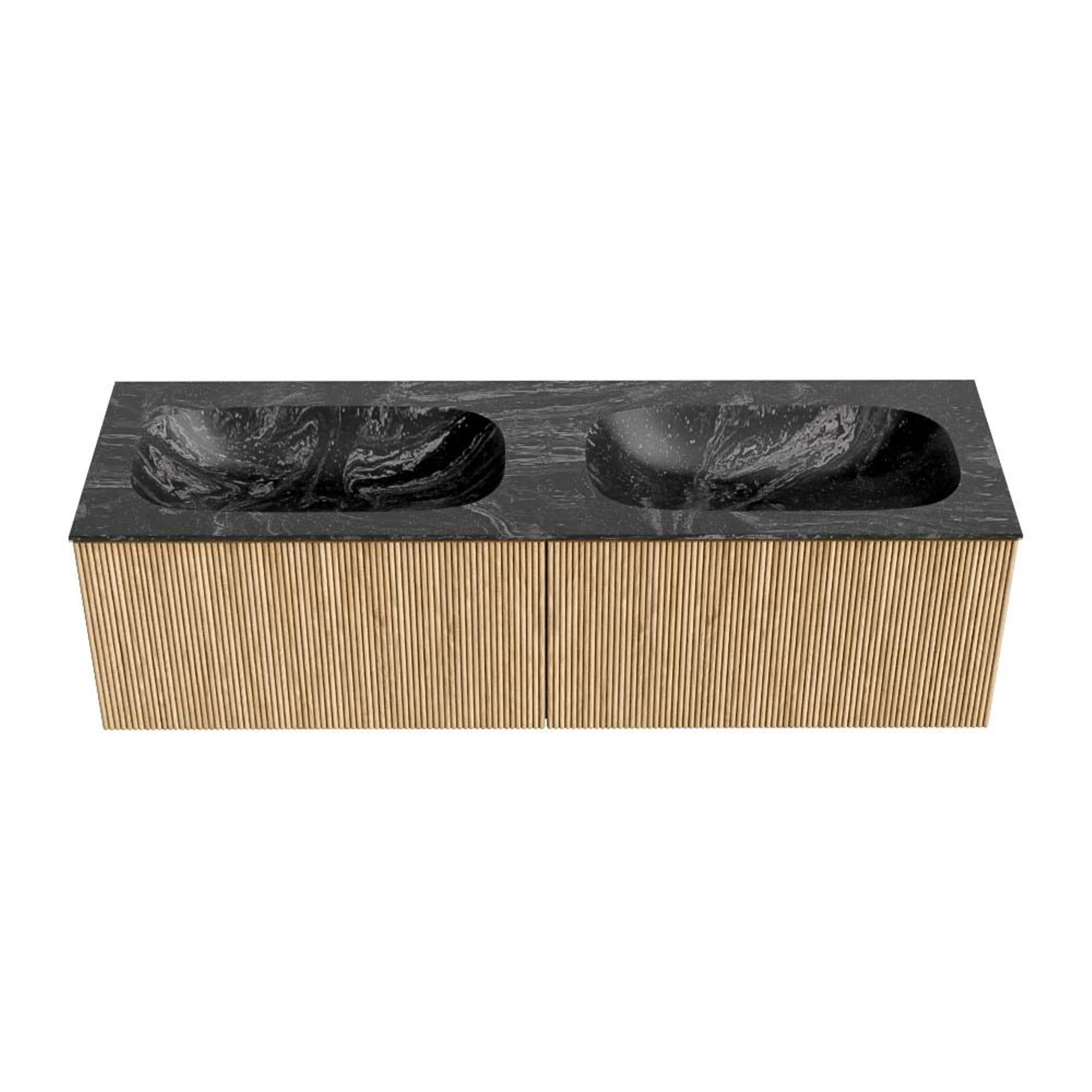 MONDIAZ KURVE-DLUX 150cm badmeubel kleur Oak met 2 lades. Wastafel STOR SMALL dubbel 2 kraangaten kleur Lava.