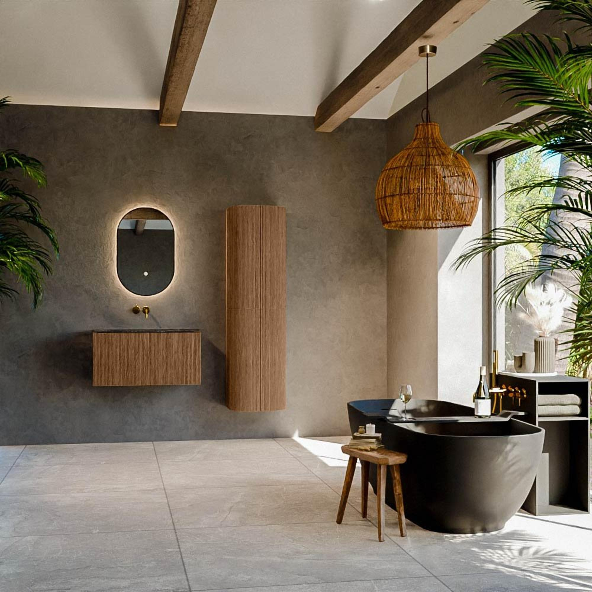 Het ultieme badmeubel dat je badkamer transformeert tot een oase van verfijning. Met zijn halfronde, verticale stroken van massief eiken, verkrijgbaar in de kleuren Oak en Walnut, straalt KURVE vakmanschap uit in elk detail. De zachte rondingen en slim ontworpen deurtjes, elk 40cm hoog, nodigen uit tot gebruik, terwijl de ruimte binnenin optimaal benut wordt dankzij de royale lade van dezelfde hoogte.