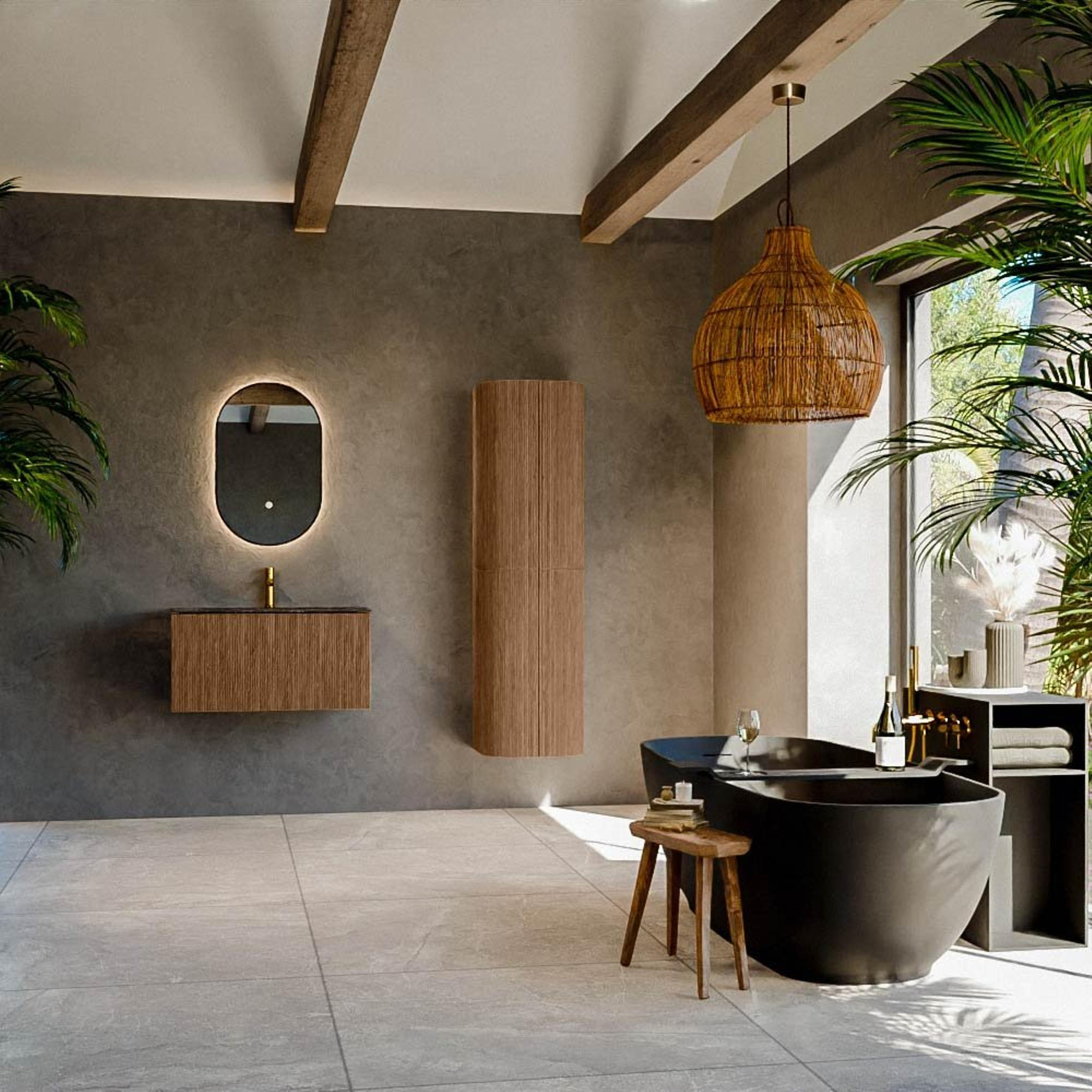 Het ultieme badmeubel dat je badkamer transformeert tot een oase van verfijning. Met zijn halfronde, verticale stroken van massief eiken, verkrijgbaar in de kleuren Oak en Walnut, straalt KURVE vakmanschap uit in elk detail. De zachte rondingen en slim ontworpen deurtjes, elk 40cm hoog, nodigen uit tot gebruik, terwijl de ruimte binnenin optimaal benut wordt dankzij de royale lade van dezelfde hoogte.