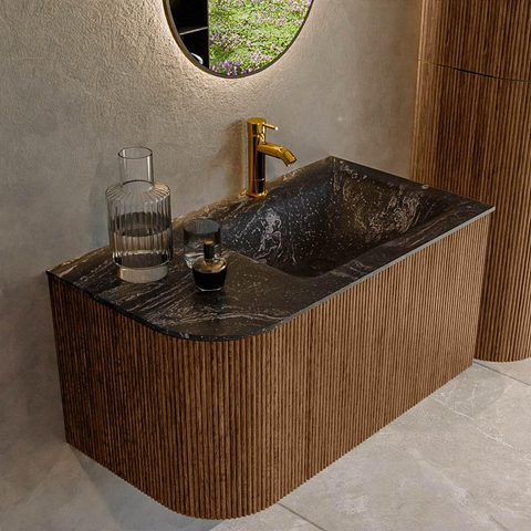 MONDIAZ KURVE-DLUX 85cm badmeubel met module 25 L kleur Walnut met 1 lade en 1 deur. Wastafel CLOUD rechts 1 kraangat kleur Lava.