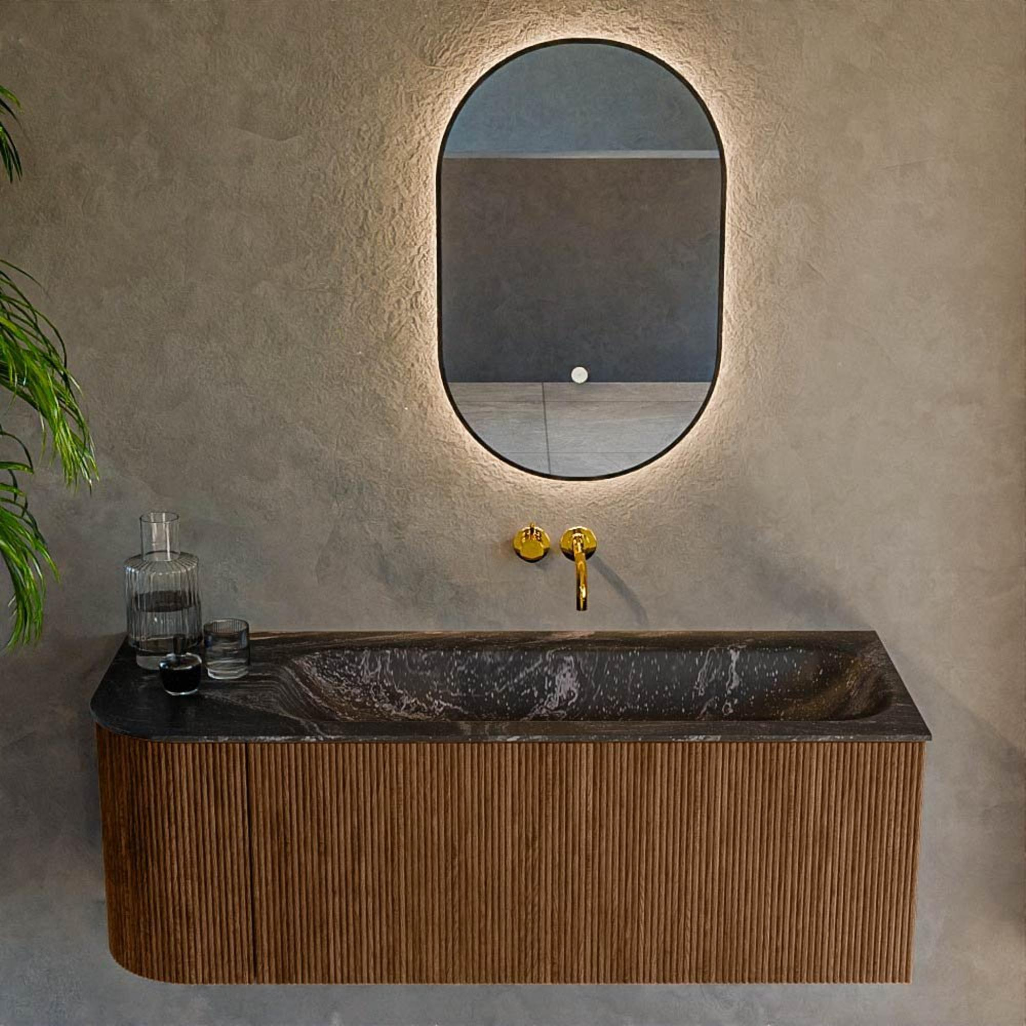Het ultieme badmeubel dat je badkamer transformeert tot een oase van verfijning. Met zijn halfronde, verticale stroken van massief eiken, verkrijgbaar in de kleuren Oak en Walnut, straalt KURVE vakmanschap uit in elk detail. De zachte rondingen en slim ontworpen deurtjes, elk 40cm hoog, nodigen uit tot gebruik, terwijl de ruimte binnenin optimaal benut wordt dankzij de royale lade van dezelfde hoogte.