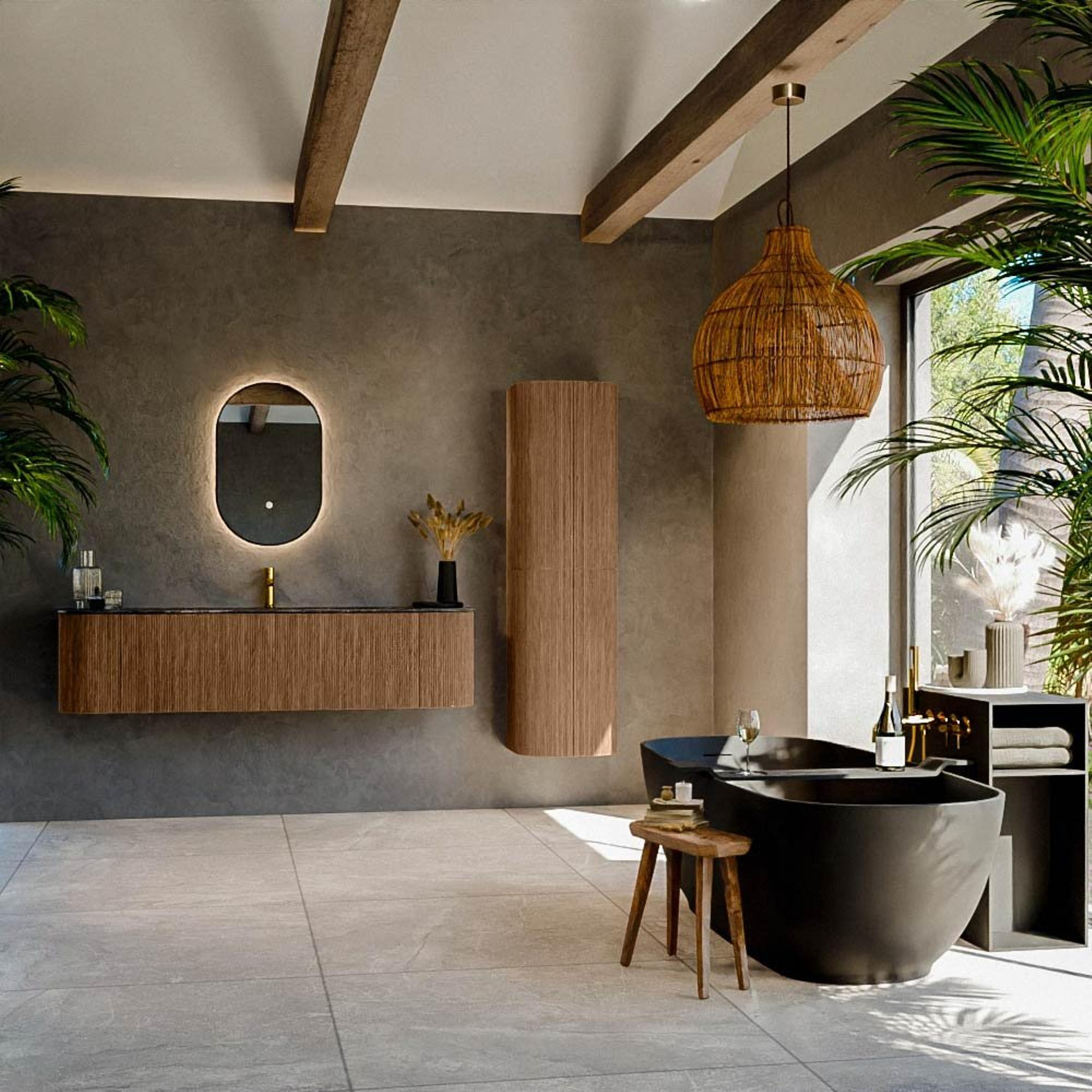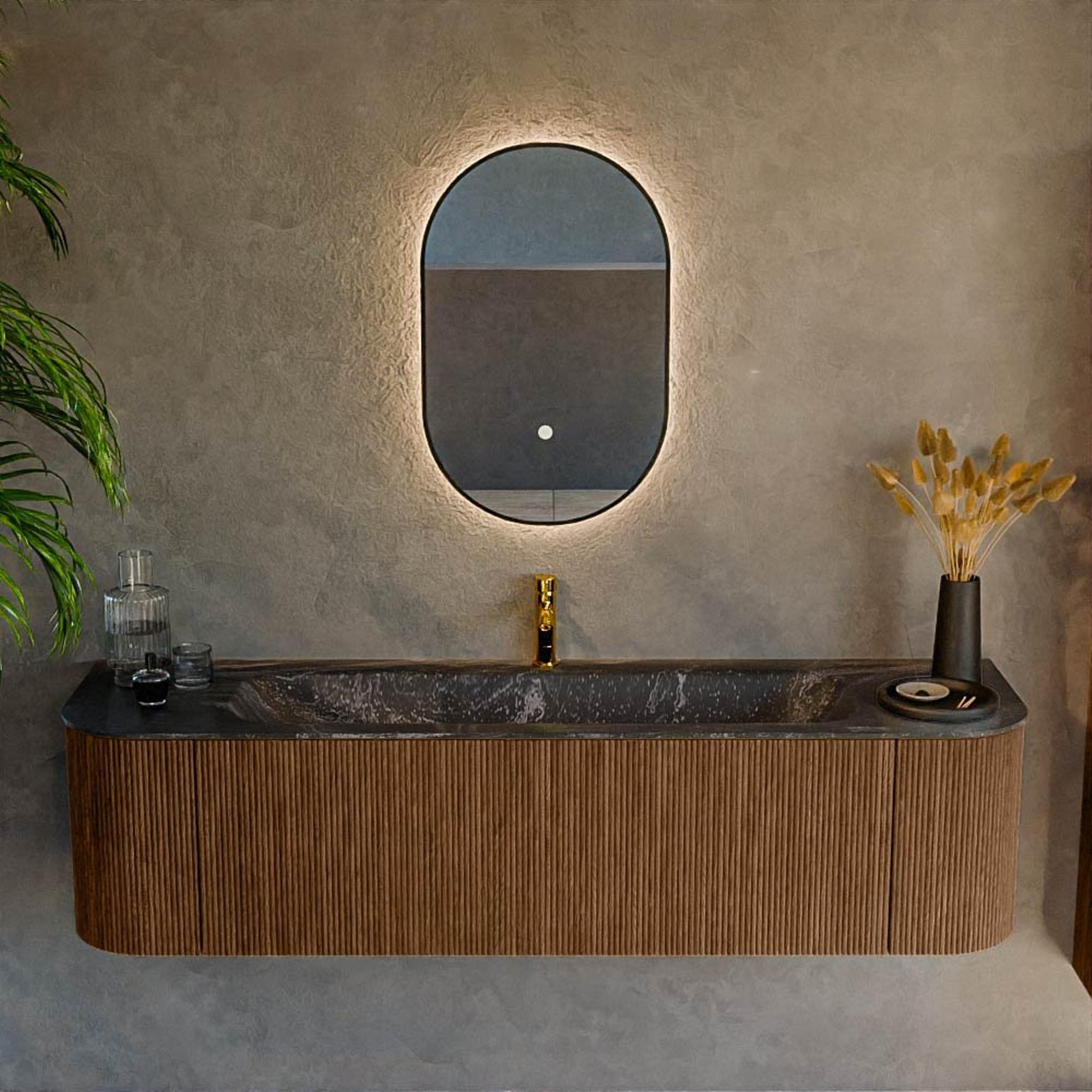 Het ultieme badmeubel dat je badkamer transformeert tot een oase van verfijning. Met zijn halfronde, verticale stroken van massief eiken, verkrijgbaar in de kleuren Oak en Walnut, straalt KURVE vakmanschap uit in elk detail. De zachte rondingen en slim ontworpen deurtjes, elk 40cm hoog, nodigen uit tot gebruik, terwijl de ruimte binnenin optimaal benut wordt dankzij de royale lade van dezelfde hoogte.