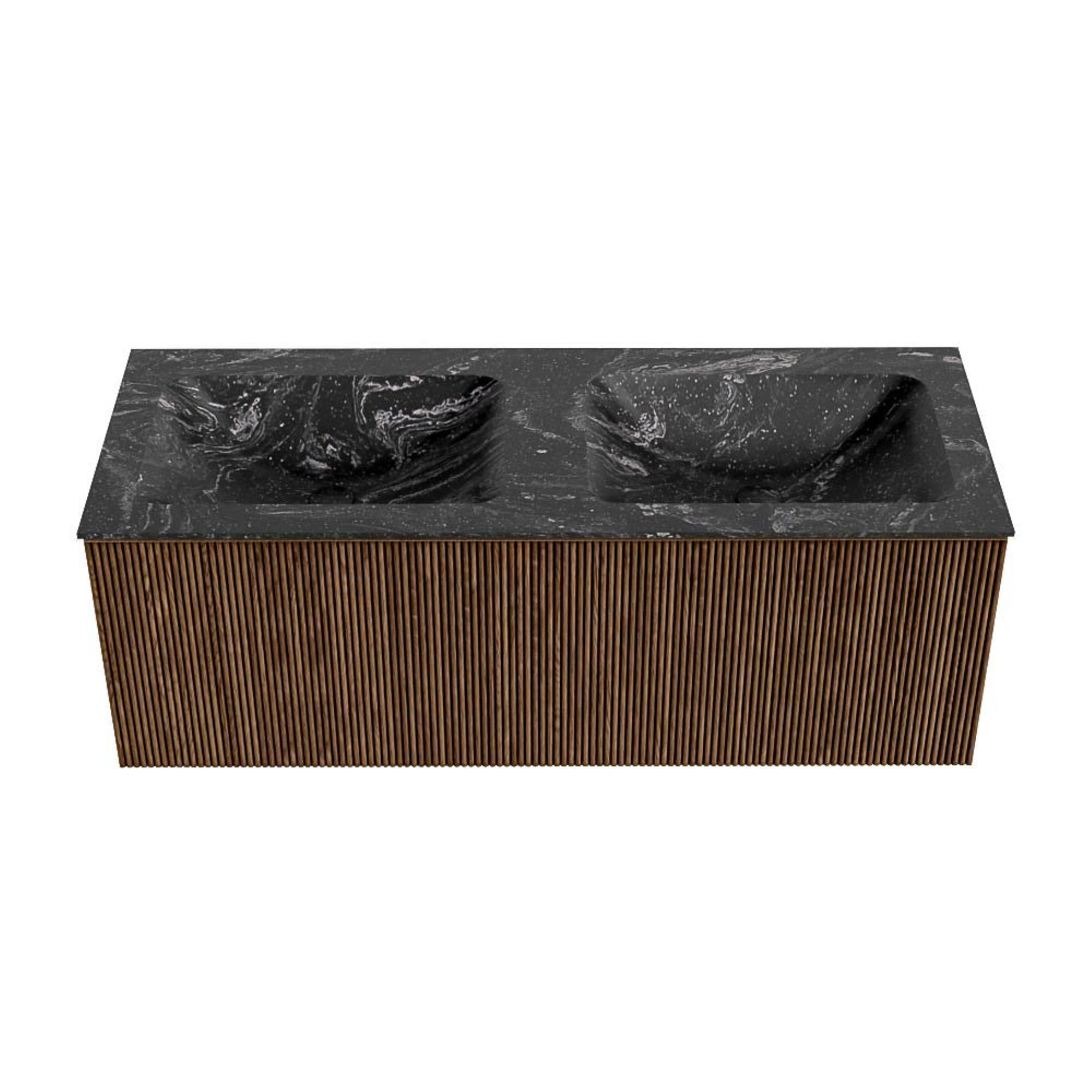 MONDIAZ KURVE-DLUX 120cm badmeubel kleur Walnut met 1 lade. Wastafel LEAF dubbel zonder kraangat kleur Lava.