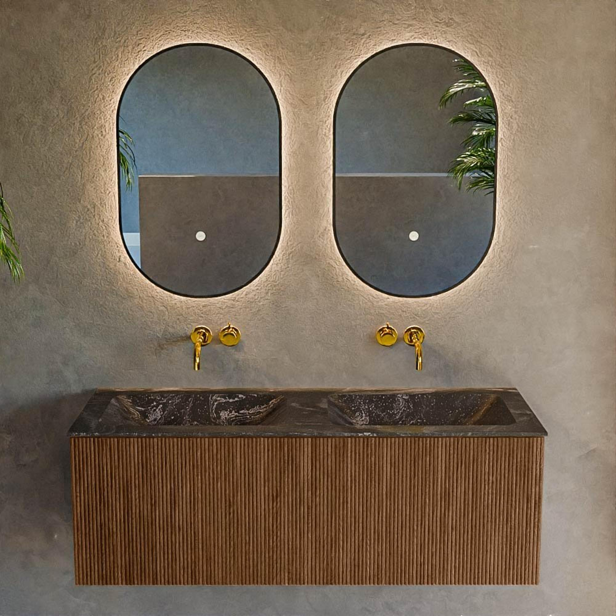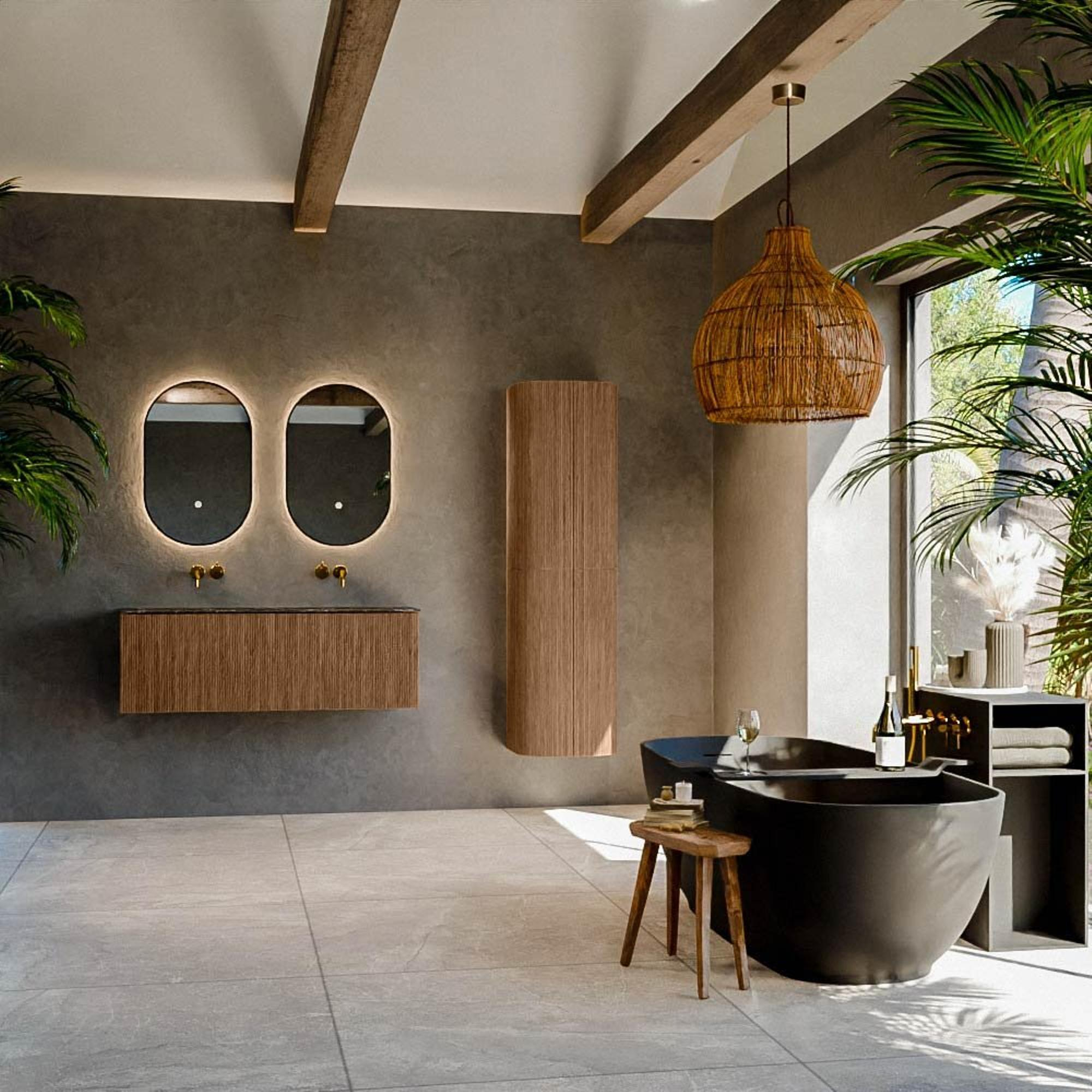 Het ultieme badmeubel dat je badkamer transformeert tot een oase van verfijning. Met zijn halfronde, verticale stroken van massief eiken, verkrijgbaar in de kleuren Oak en Walnut, straalt KURVE vakmanschap uit in elk detail. De zachte rondingen en slim ontworpen deurtjes, elk 40cm hoog, nodigen uit tot gebruik, terwijl de ruimte binnenin optimaal benut wordt dankzij de royale lade van dezelfde hoogte.