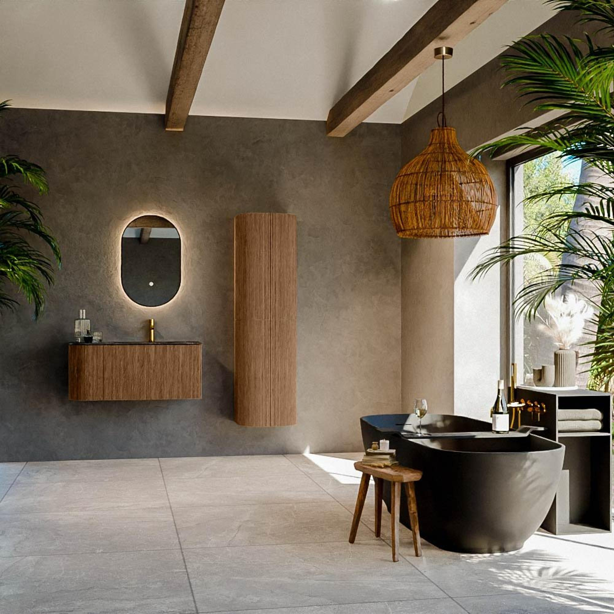 Het ultieme badmeubel dat je badkamer transformeert tot een oase van verfijning. Met zijn halfronde, verticale stroken van massief eiken, verkrijgbaar in de kleuren Oak en Walnut, straalt KURVE vakmanschap uit in elk detail. De zachte rondingen en slim ontworpen deurtjes, elk 40cm hoog, nodigen uit tot gebruik, terwijl de ruimte binnenin optimaal benut wordt dankzij de royale lade van dezelfde hoogte.