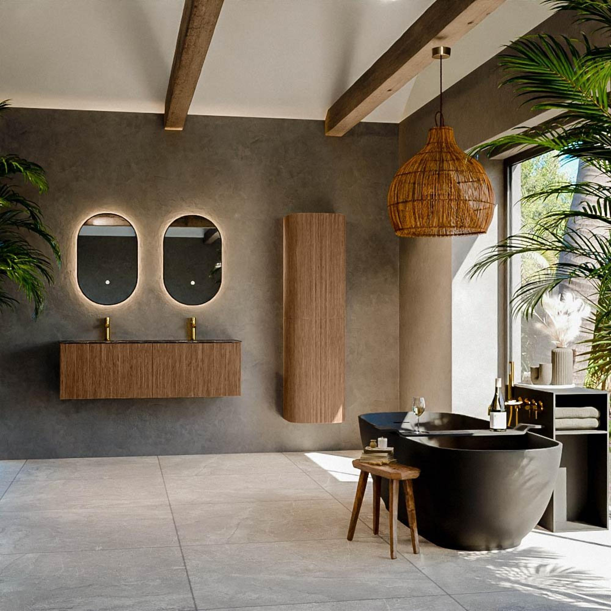 Het ultieme badmeubel dat je badkamer transformeert tot een oase van verfijning. Met zijn halfronde, verticale stroken van massief eiken, verkrijgbaar in de kleuren Oak en Walnut, straalt KURVE vakmanschap uit in elk detail. De zachte rondingen en slim ontworpen deurtjes, elk 40cm hoog, nodigen uit tot gebruik, terwijl de ruimte binnenin optimaal benut wordt dankzij de royale lade van dezelfde hoogte.