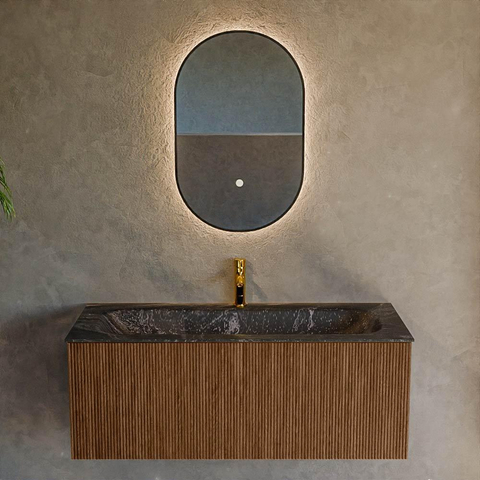 Het ultieme badmeubel dat je badkamer transformeert tot een oase van verfijning. Met zijn halfronde, verticale stroken van massief eiken, verkrijgbaar in de kleuren Oak en Walnut, straalt KURVE vakmanschap uit in elk detail. De zachte rondingen en slim ontworpen deurtjes, elk 40cm hoog, nodigen uit tot gebruik, terwijl de ruimte binnenin optimaal benut wordt dankzij de royale lade van dezelfde hoogte.