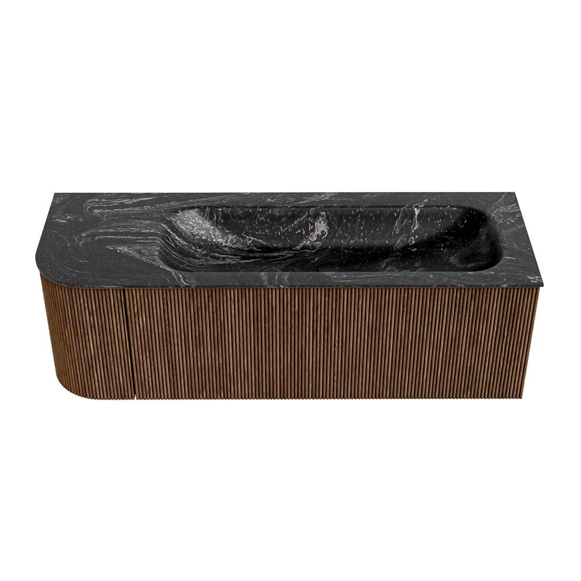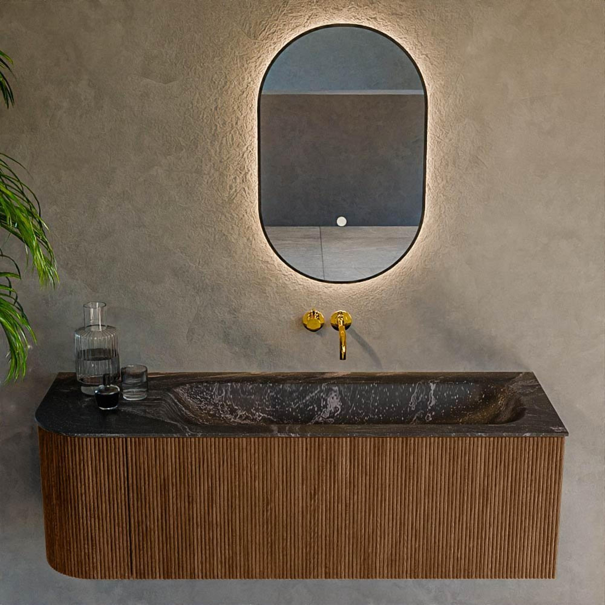 MONDIAZ KURVE-DLUX 135cm badmeubel met module 25 L kleur Walnut met 1 lade en 1 deur. Wastafel BIG MEDIUM rechts zonder kraangat kleur Lava.