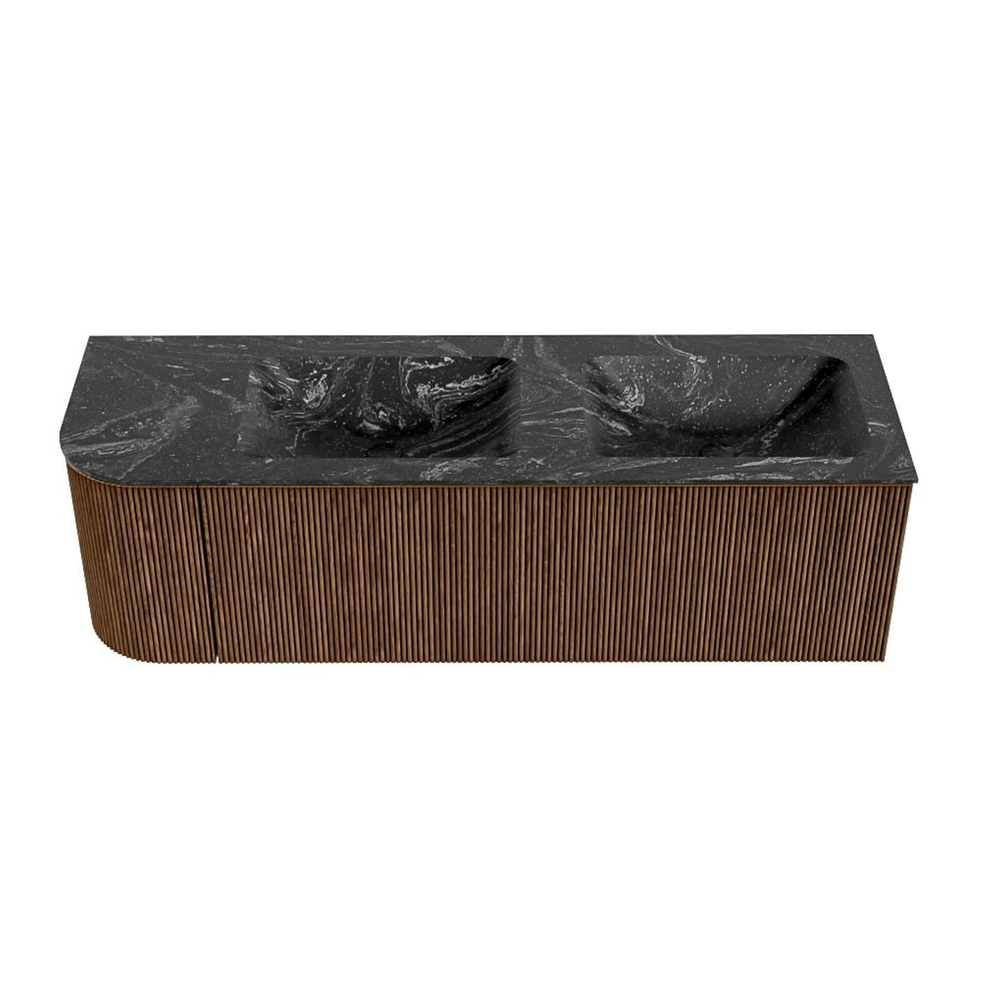 MONDIAZ KURVE-DLUX 145cm badmeubel met module 25 L kleur Walnut met 1 lade en 1 deur. Wastafel LEAF dubbel / rechts zonder kraangat kleur Lava.