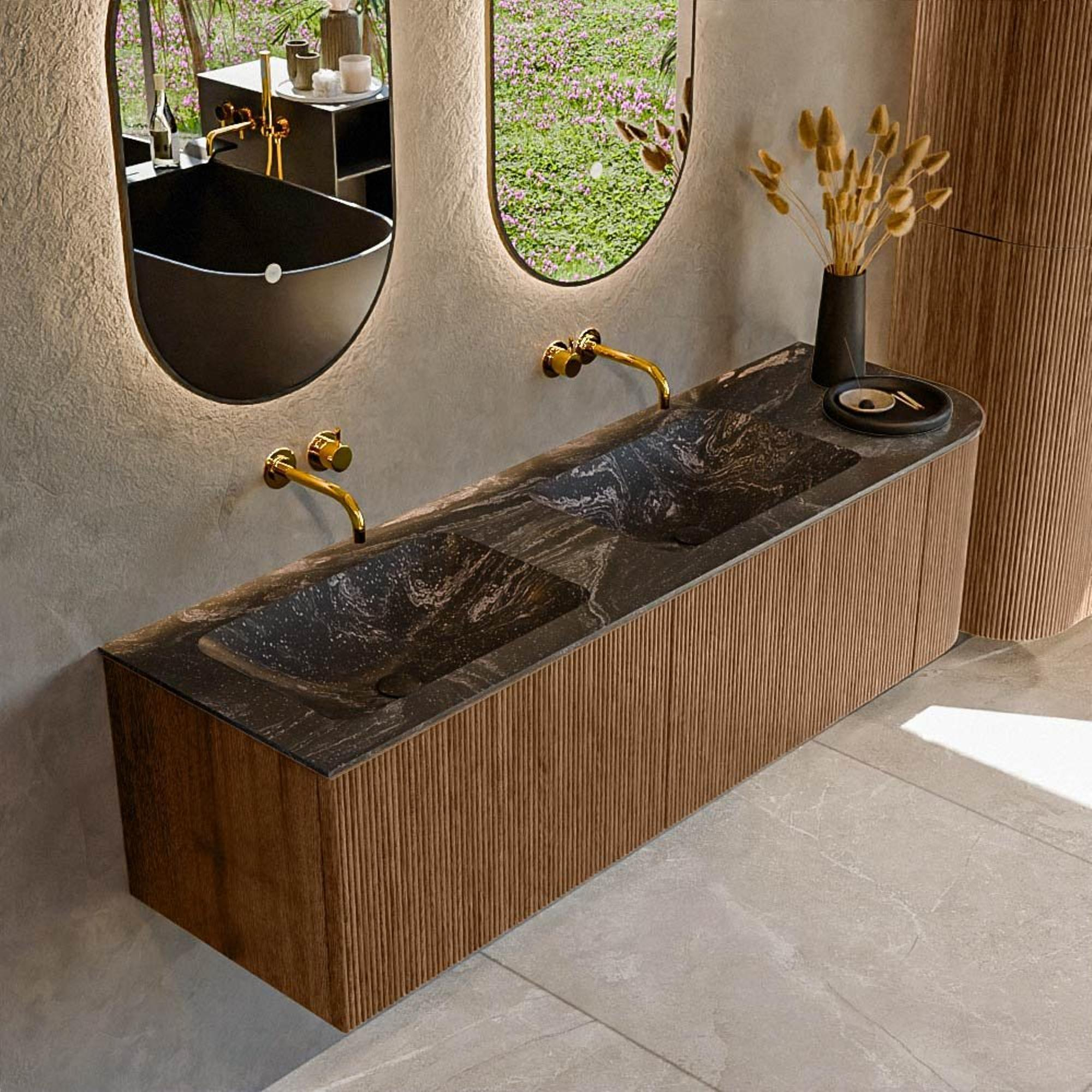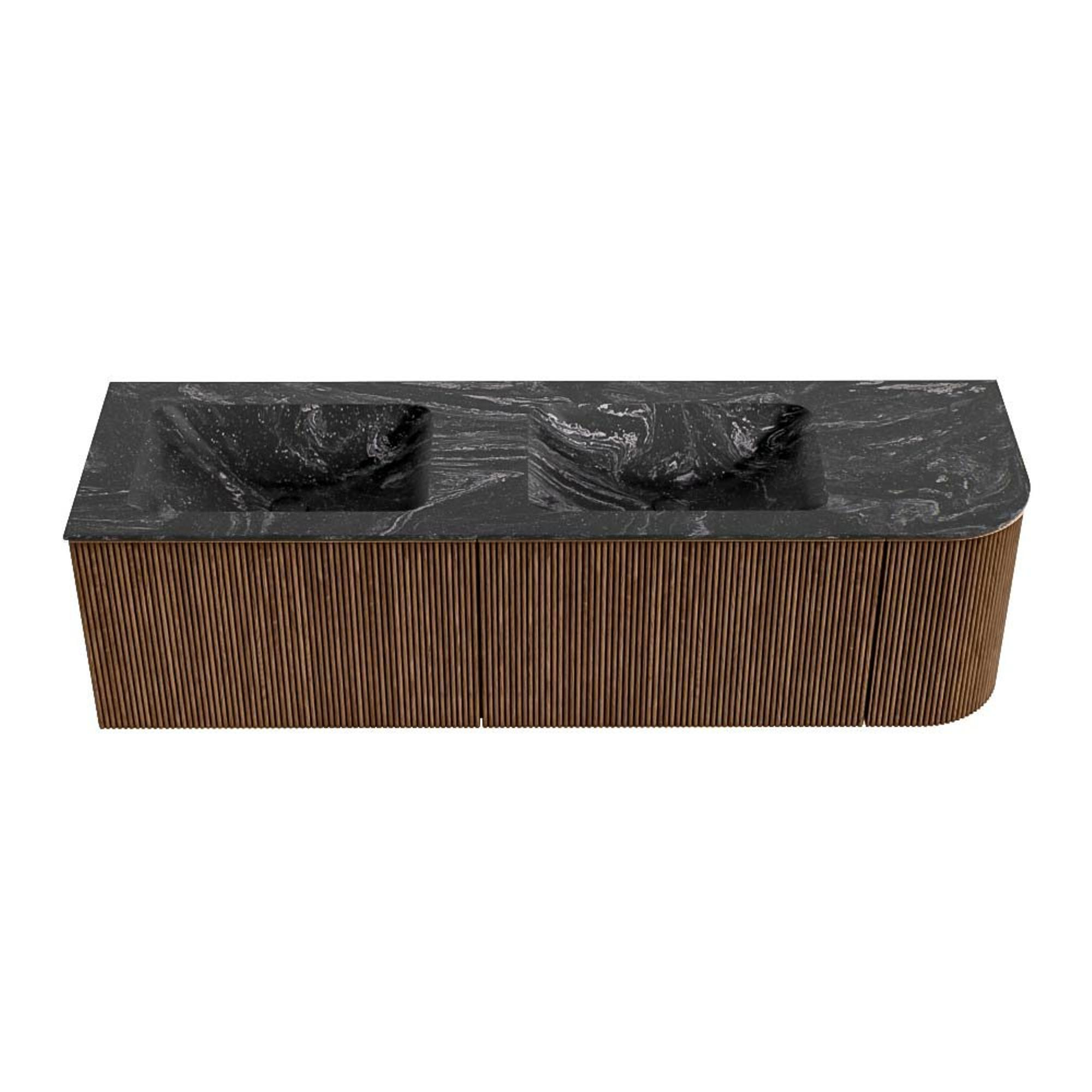 MONDIAZ KURVE-DLUX 155cm badmeubel met module 25 R kleur Walnut met 2 lades en 1 deur. Wastafel LEAF dubbel / links zonder kraangat kleur Lava.