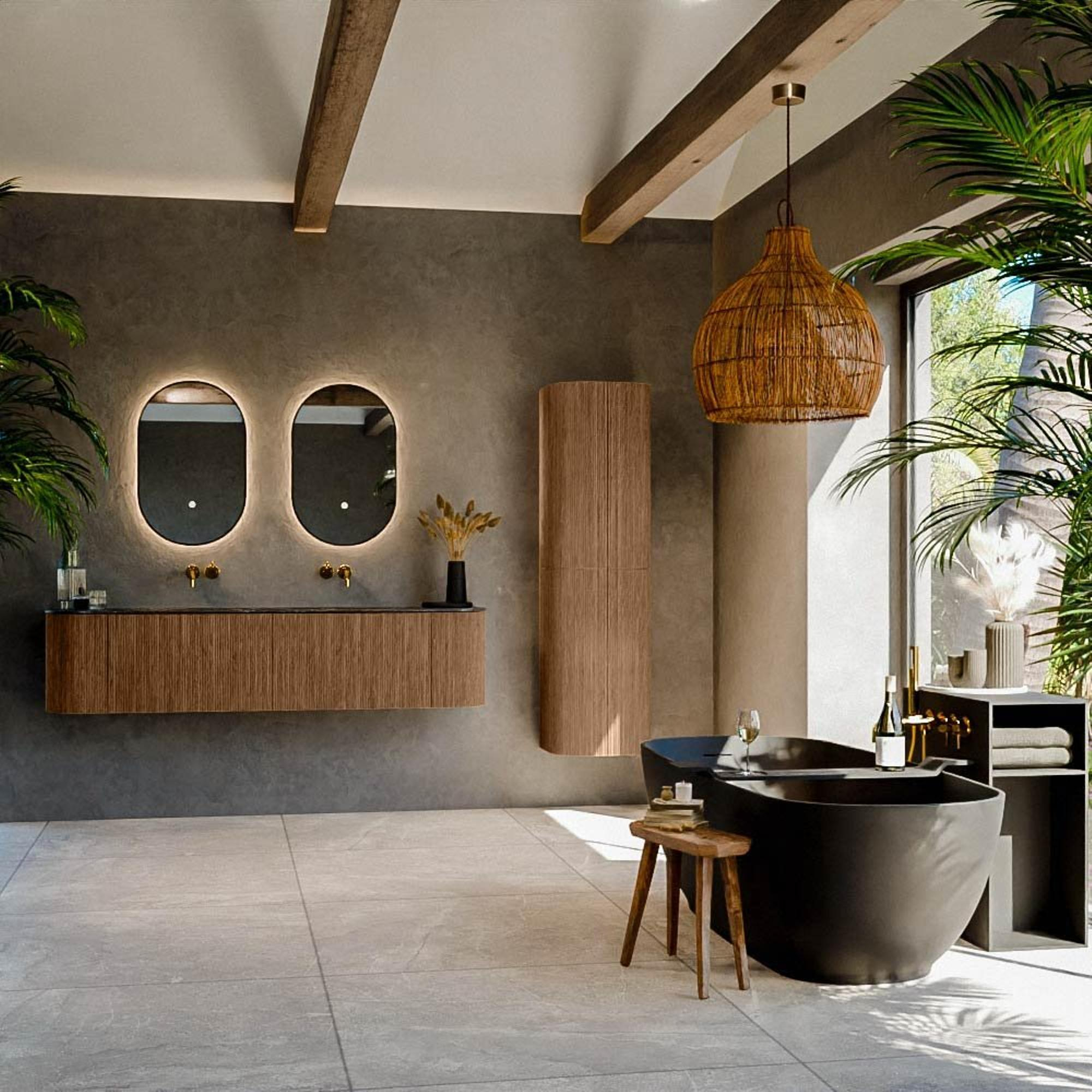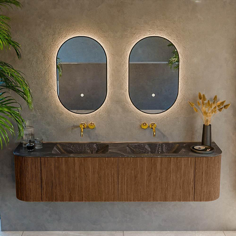 Het ultieme badmeubel dat je badkamer transformeert tot een oase van verfijning. Met zijn halfronde, verticale stroken van massief eiken, verkrijgbaar in de kleuren Oak en Walnut, straalt KURVE vakmanschap uit in elk detail. De zachte rondingen en slim ontworpen deurtjes, elk 40cm hoog, nodigen uit tot gebruik, terwijl de ruimte binnenin optimaal benut wordt dankzij de royale lade van dezelfde hoogte.