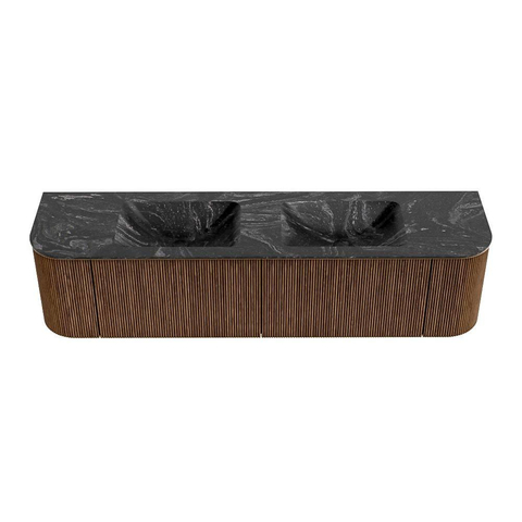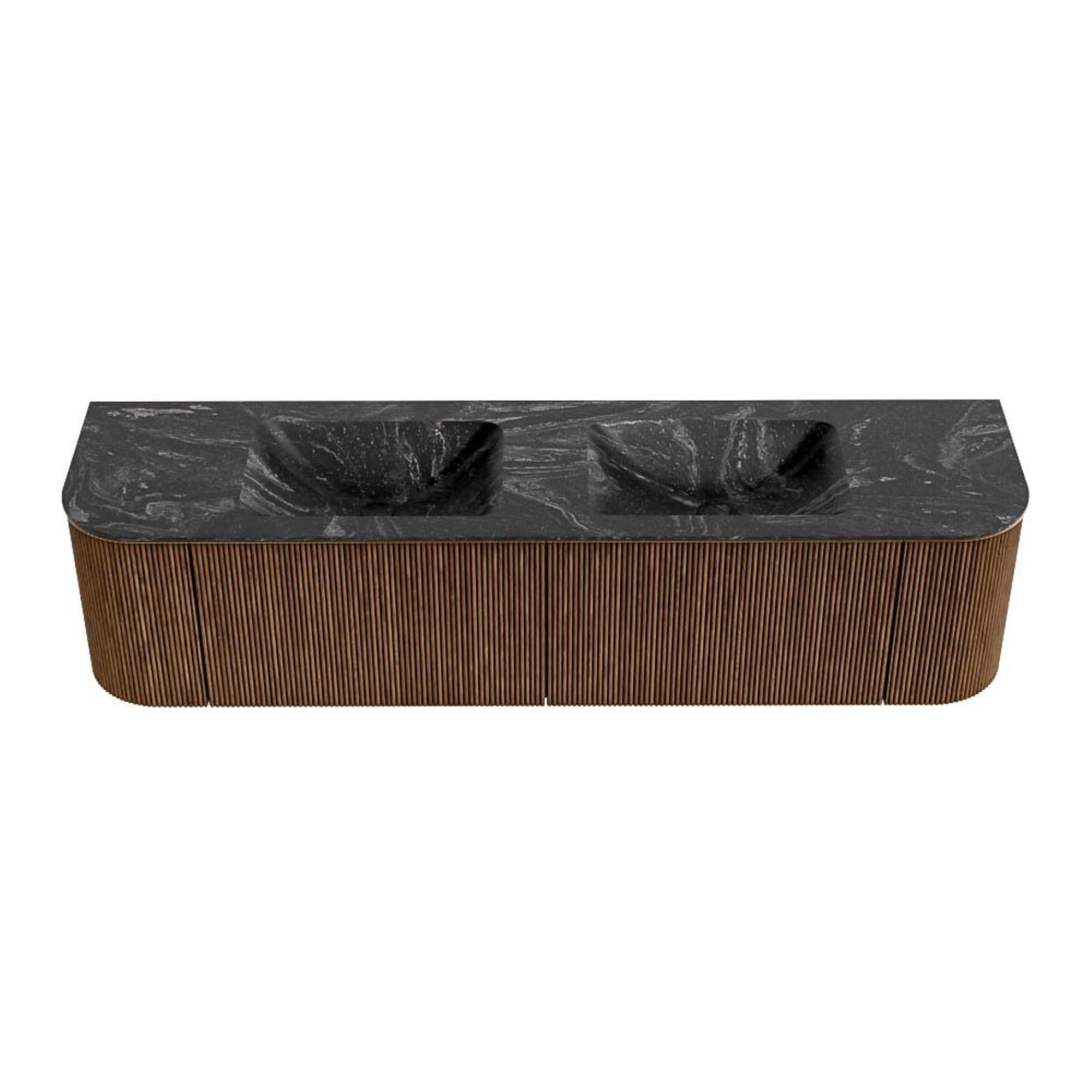 MONDIAZ KURVE-DLUX 180cm badmeubel met module 25 Len R kleur Walnut met 2 lades en 2 deuren. Wastafel LEAF dubbel zonder kraangat kleur Lava.