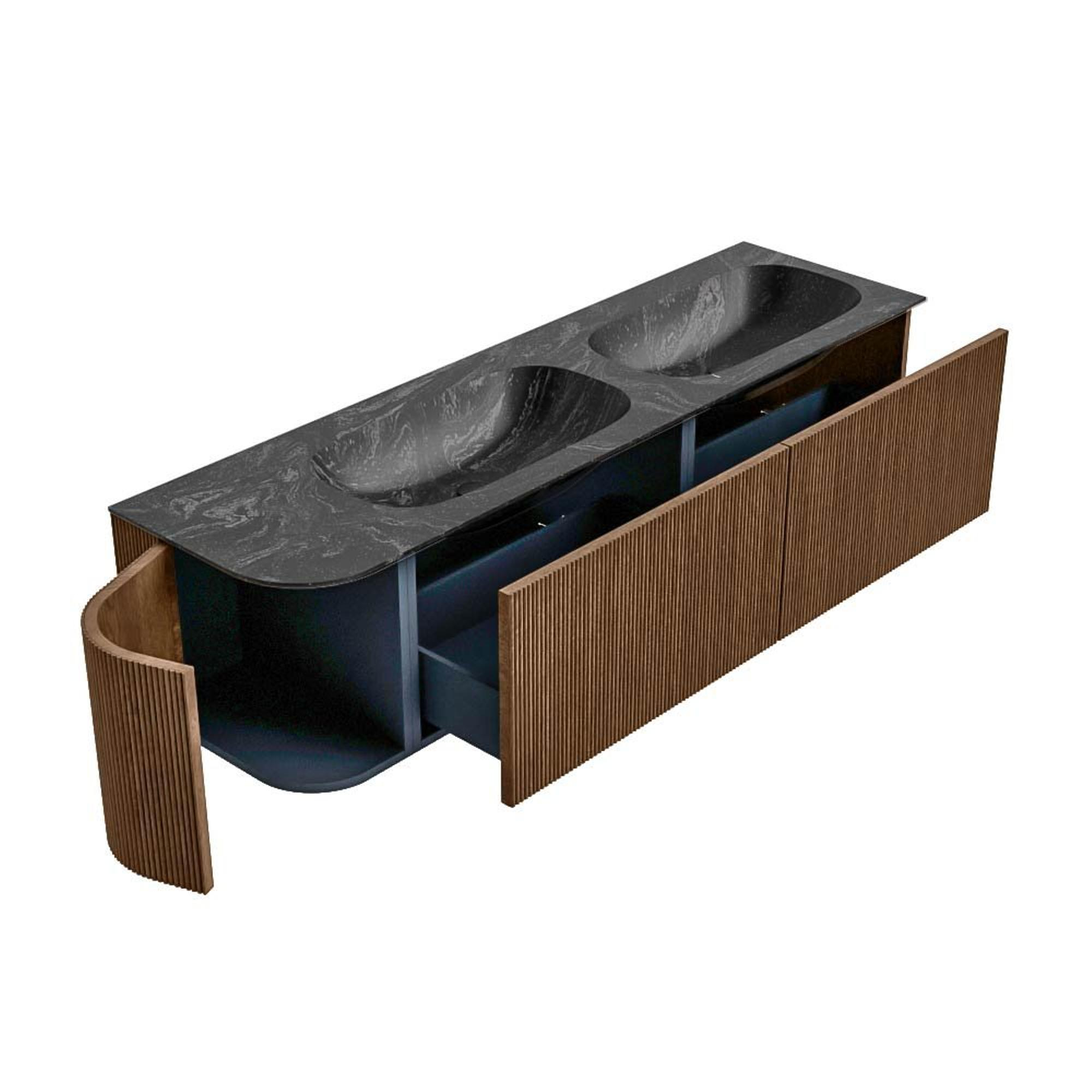 MONDIAZ KURVE-DLUX 165cm badmeubel met module 25 L kleur Walnut met 2 lades en 1 deur. Wastafel STOR SMALL dubbel / rechts zonder kraangat kleur Lava.