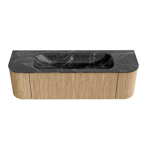 Het ultieme badmeubel dat je badkamer transformeert tot een oase van verfijning. Met zijn halfronde, verticale stroken van massief eiken, verkrijgbaar in de kleuren Oak en Walnut, straalt KURVE vakmanschap uit in elk detail. De zachte rondingen en slim ontworpen deurtjes, elk 40cm hoog, nodigen uit tot gebruik, terwijl de ruimte binnenin optimaal benut wordt dankzij de royale lade van dezelfde hoogte.