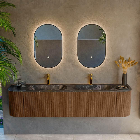 Het ultieme badmeubel dat je badkamer transformeert tot een oase van verfijning. Met zijn halfronde, verticale stroken van massief eiken, verkrijgbaar in de kleuren Oak en Walnut, straalt KURVE vakmanschap uit in elk detail. De zachte rondingen en slim ontworpen deurtjes, elk 40cm hoog, nodigen uit tot gebruik, terwijl de ruimte binnenin optimaal benut wordt dankzij de royale lade van dezelfde hoogte.