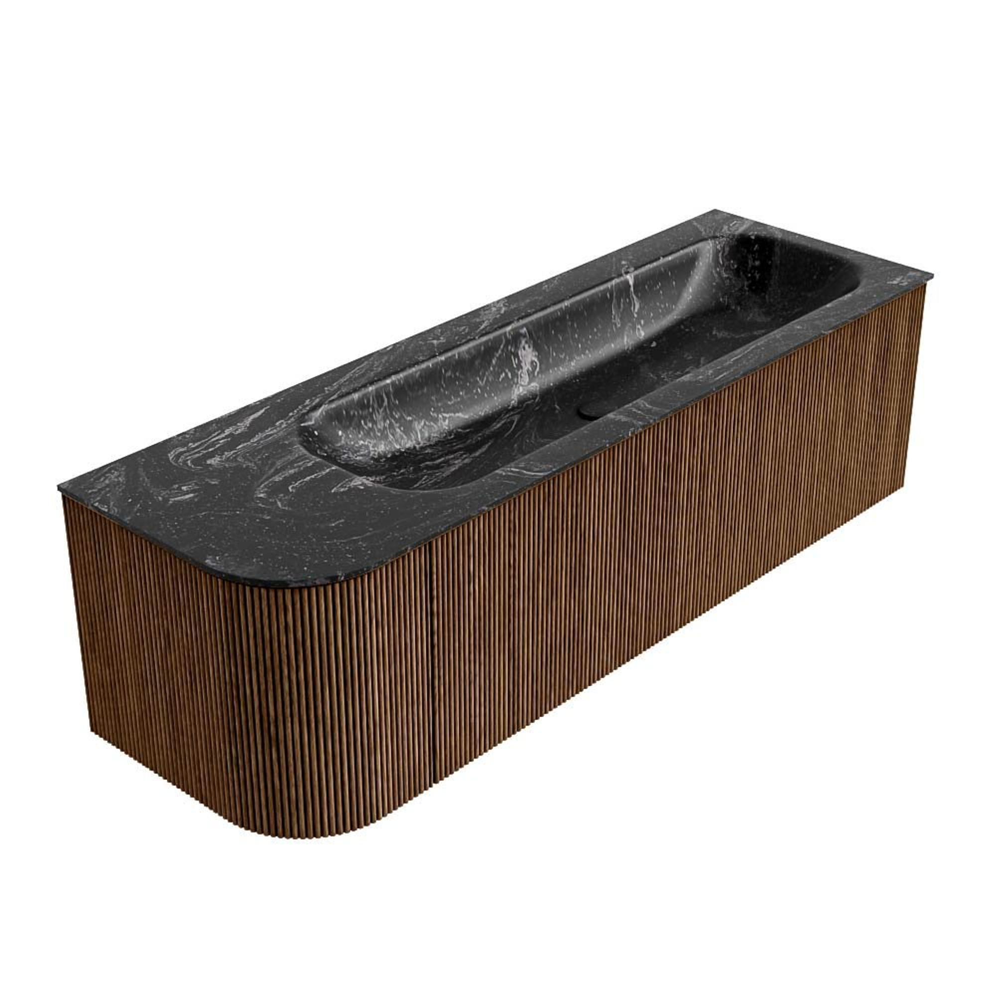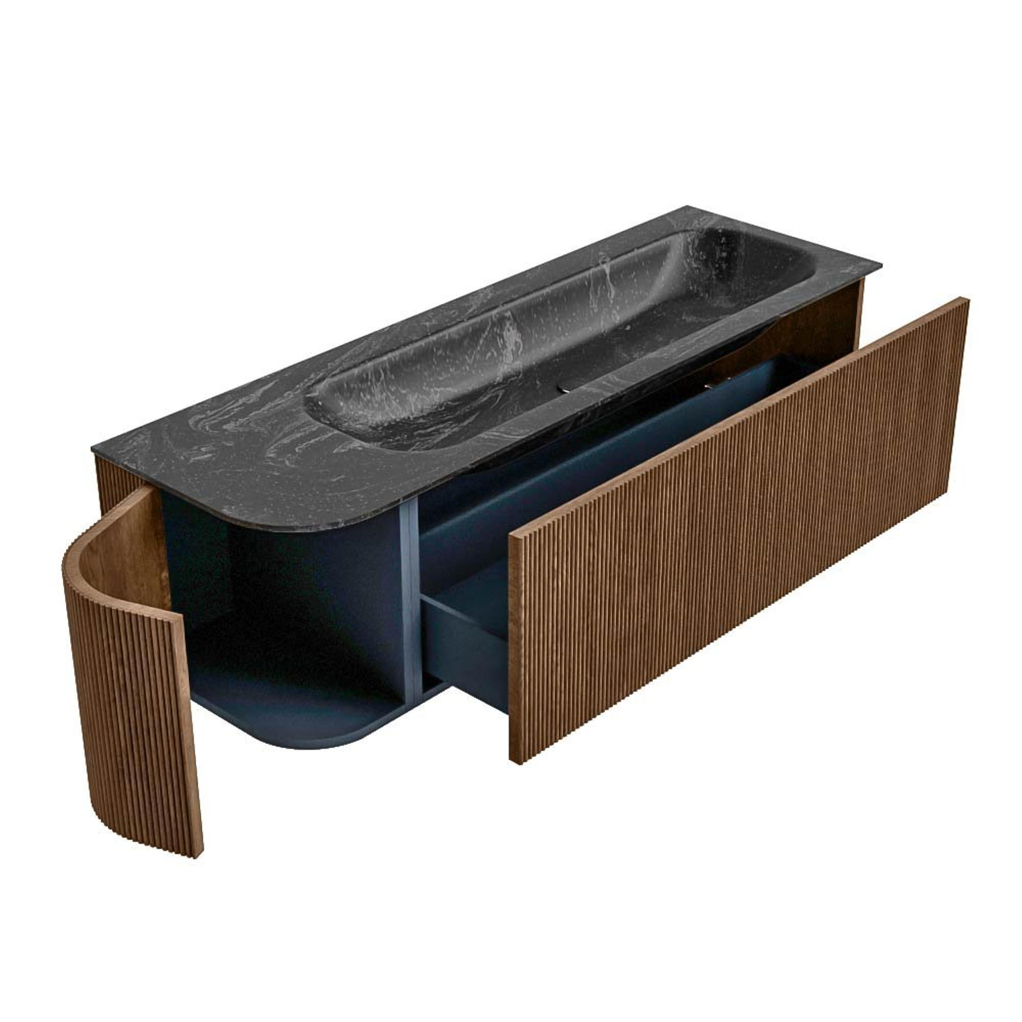 MONDIAZ KURVE-DLUX 145cm badmeubel met module 25 L kleur Walnut met 1 lade en 1 deur. Wastafel BIG LARGE rechts 2 kraangaten kleur Lava.