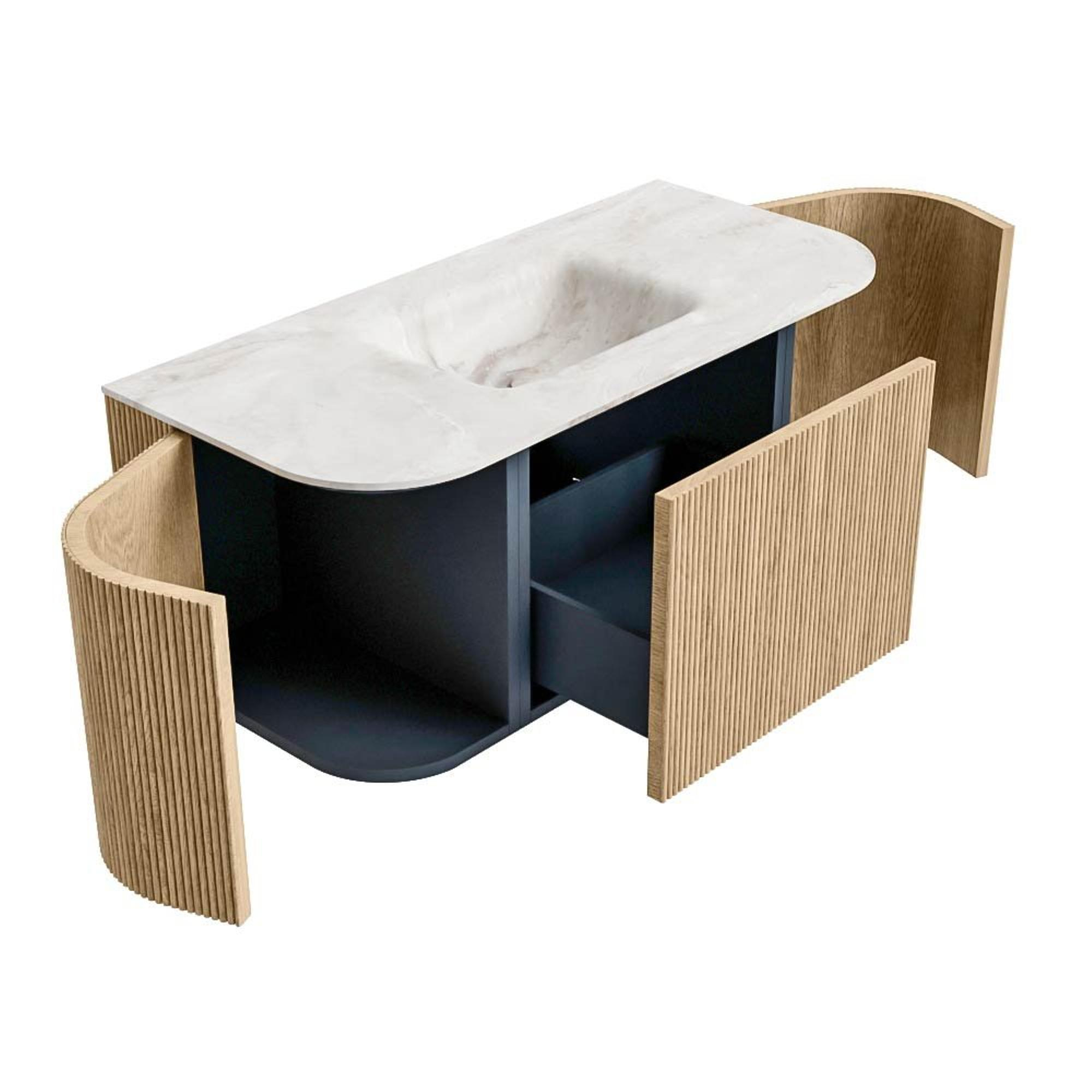 Het ultieme badmeubel dat je badkamer transformeert tot een oase van verfijning. Met zijn halfronde, verticale stroken van massief eiken, verkrijgbaar in de kleuren Oak en Walnut, straalt KURVE vakmanschap uit in elk detail. De zachte rondingen en slim ontworpen deurtjes, elk 40cm hoog, nodigen uit tot gebruik, terwijl de ruimte binnenin optimaal benut wordt dankzij de royale lade van dezelfde hoogte.