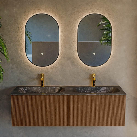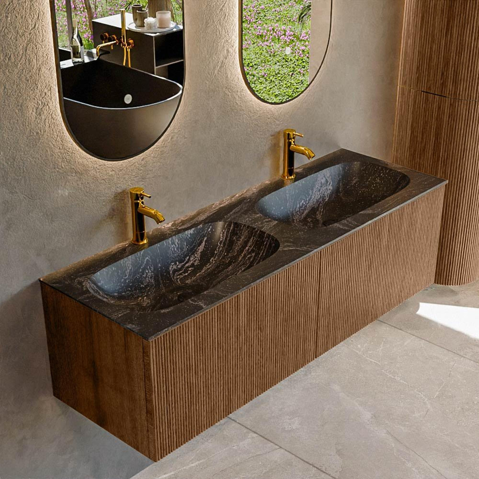 MONDIAZ KURVE-DLUX 140cm badmeubel kleur Walnut met 2 lades. Wastafel STOR SMALL dubbel 2 kraangaten kleur Lava.