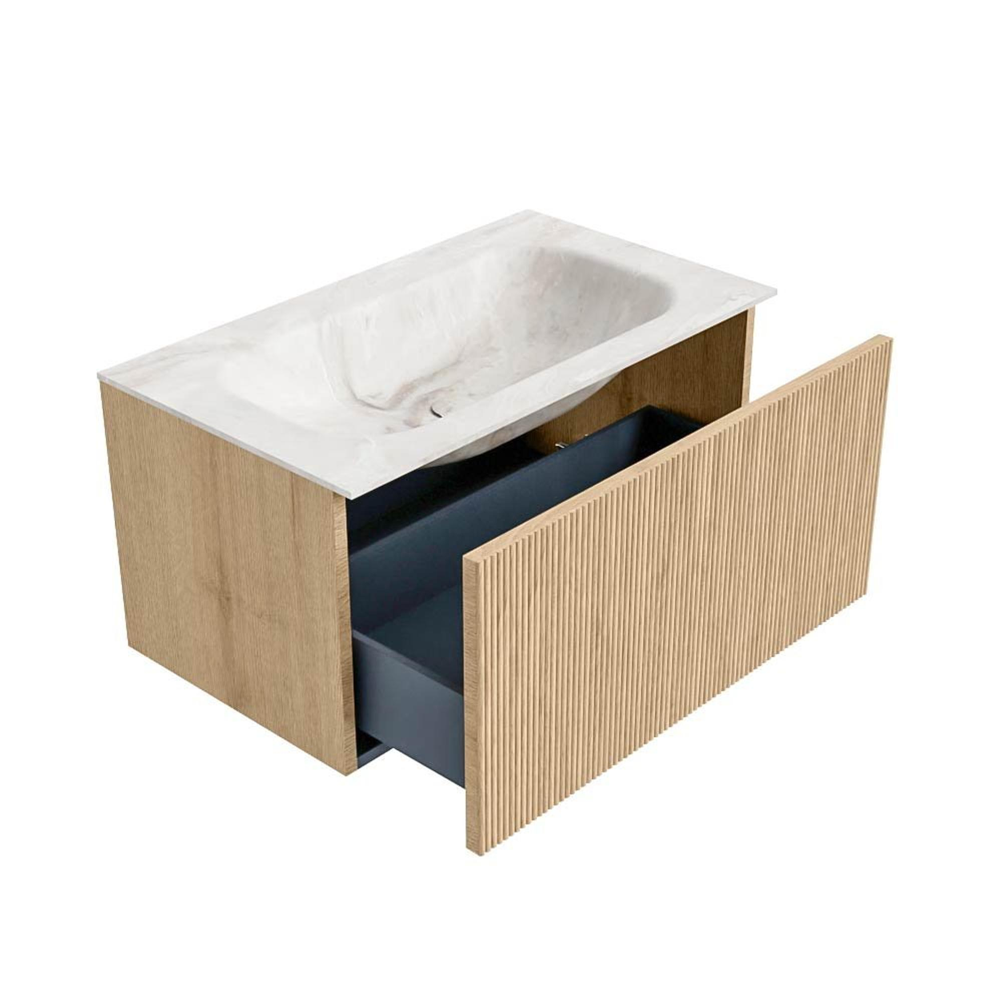 MONDIAZ KURVE-DLUX 80cm badmeubel kleur Oak met 1 lade. Wastafel BIG SMALL midden 1 kraangat kleur Frappe.