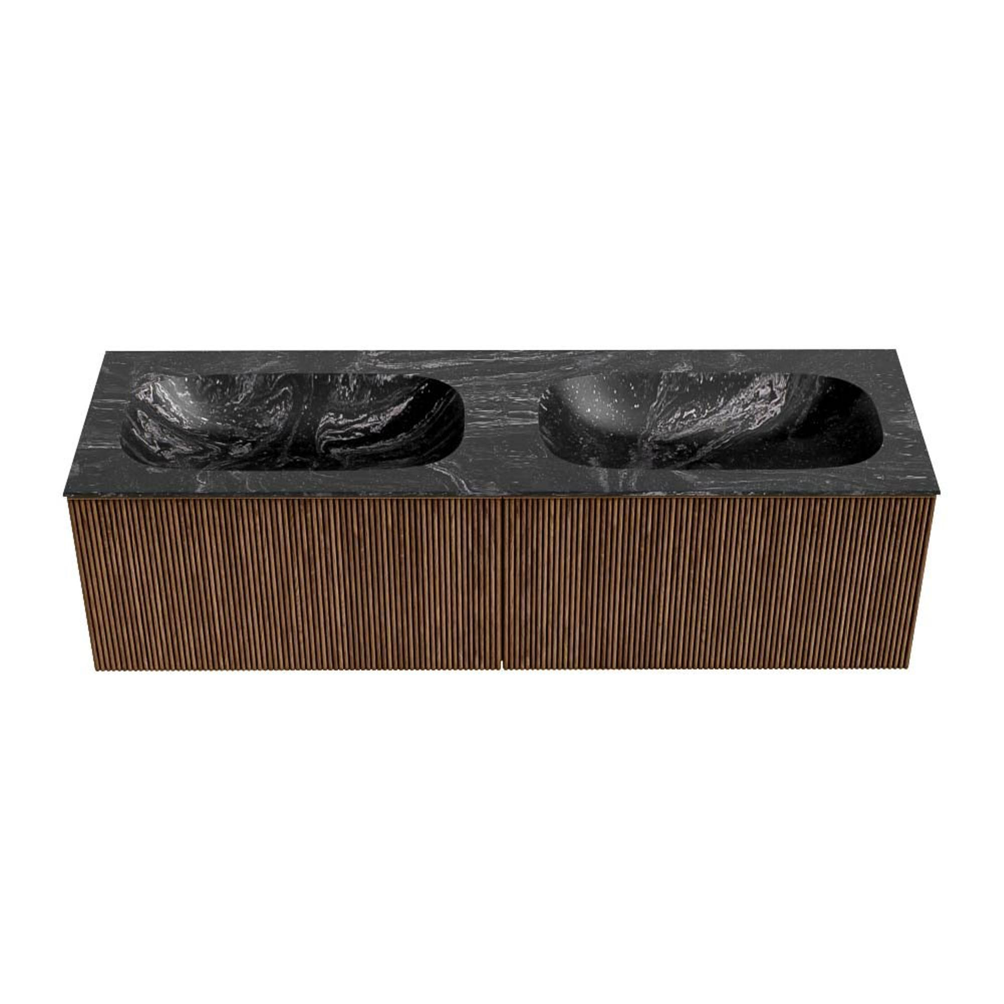 MONDIAZ KURVE-DLUX 150cm badmeubel kleur Walnut met 2 lades. Wastafel STOR SMALL dubbel 2 kraangaten kleur Lava.