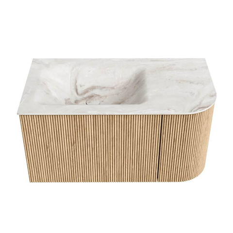 MONDIAZ KURVE-DLUX 85cm badmeubel met module 25 R kleur Oak met 1 lade en 1 deur. Wastafel CLOUD links zonder kraangat kleur Frappe.