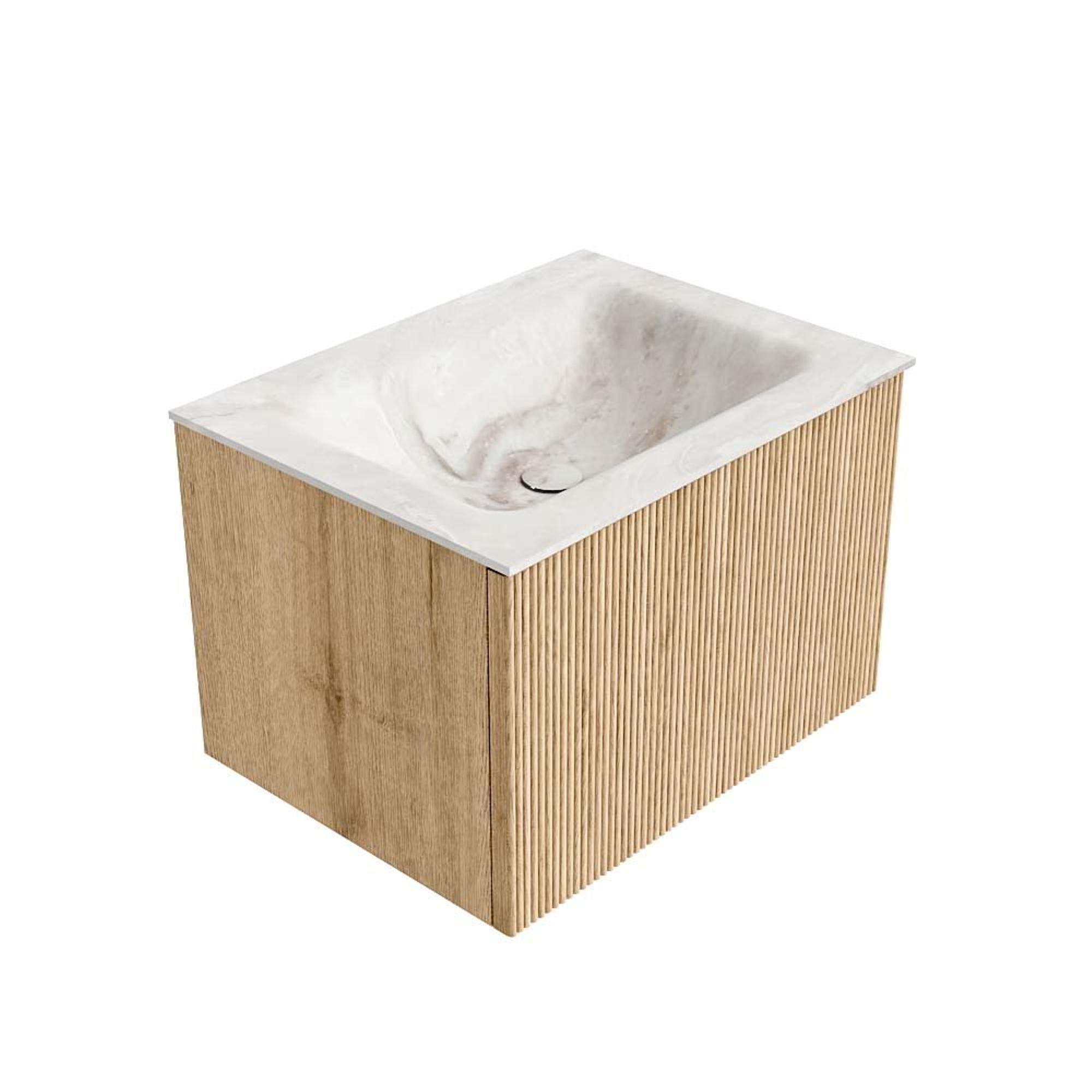 MONDIAZ KURVE-DLUX 60cm badmeubel kleur Oak met 1 lade. Wastafel CLOUD midden 1 kraangat kleur Frappe.