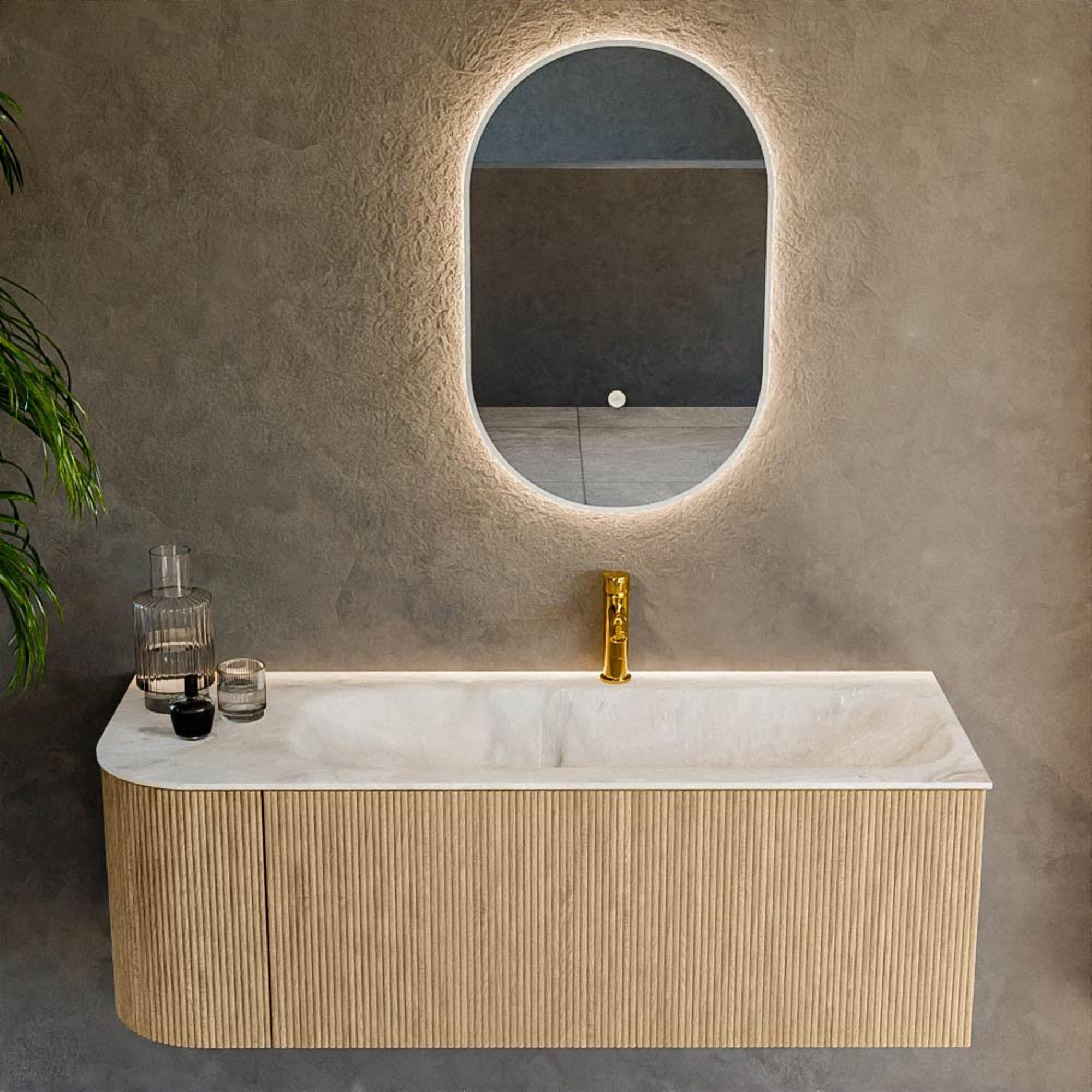 Het ultieme badmeubel dat je badkamer transformeert tot een oase van verfijning. Met zijn halfronde, verticale stroken van massief eiken, verkrijgbaar in de kleuren Oak en Walnut, straalt KURVE vakmanschap uit in elk detail. De zachte rondingen en slim ontworpen deurtjes, elk 40cm hoog, nodigen uit tot gebruik, terwijl de ruimte binnenin optimaal benut wordt dankzij de royale lade van dezelfde hoogte.