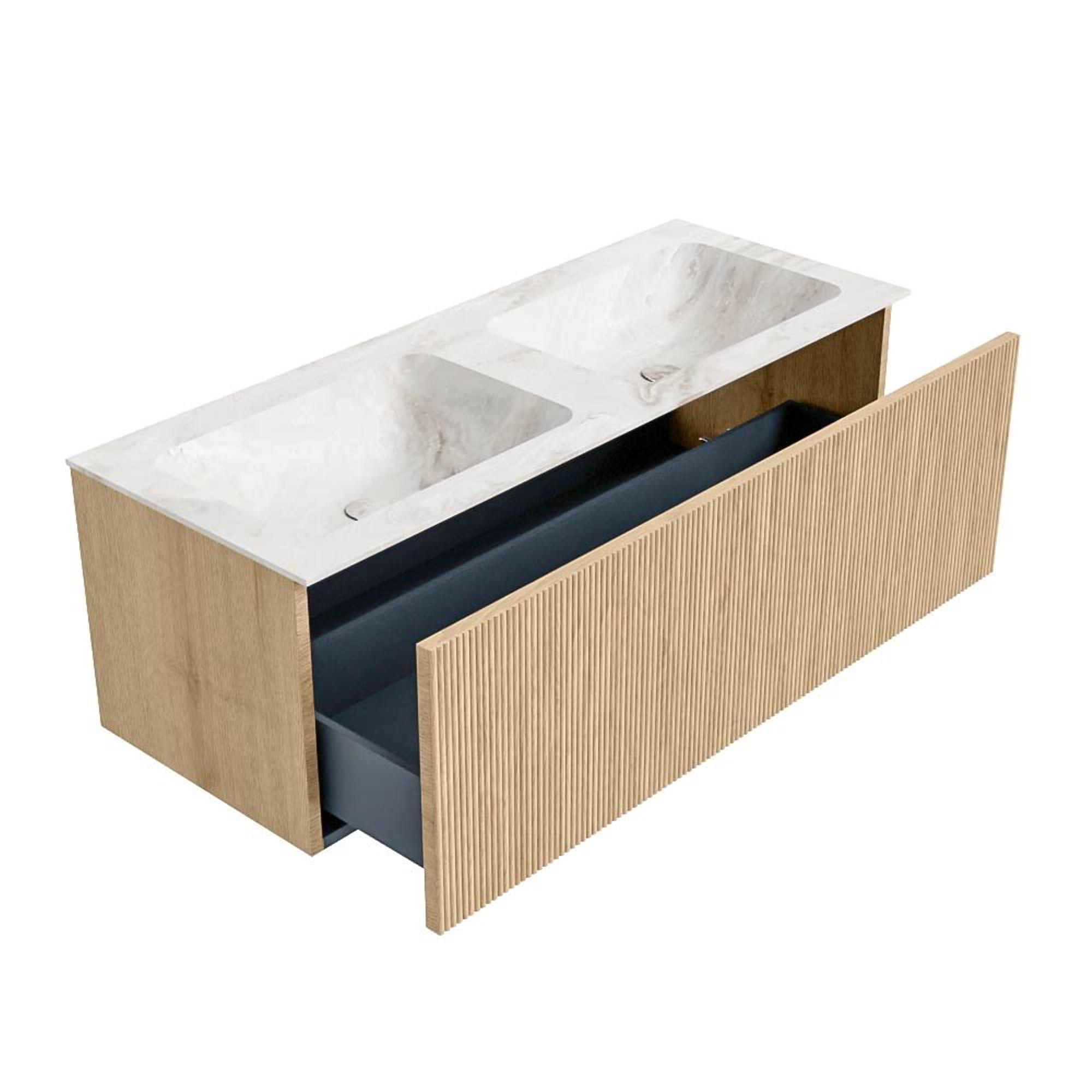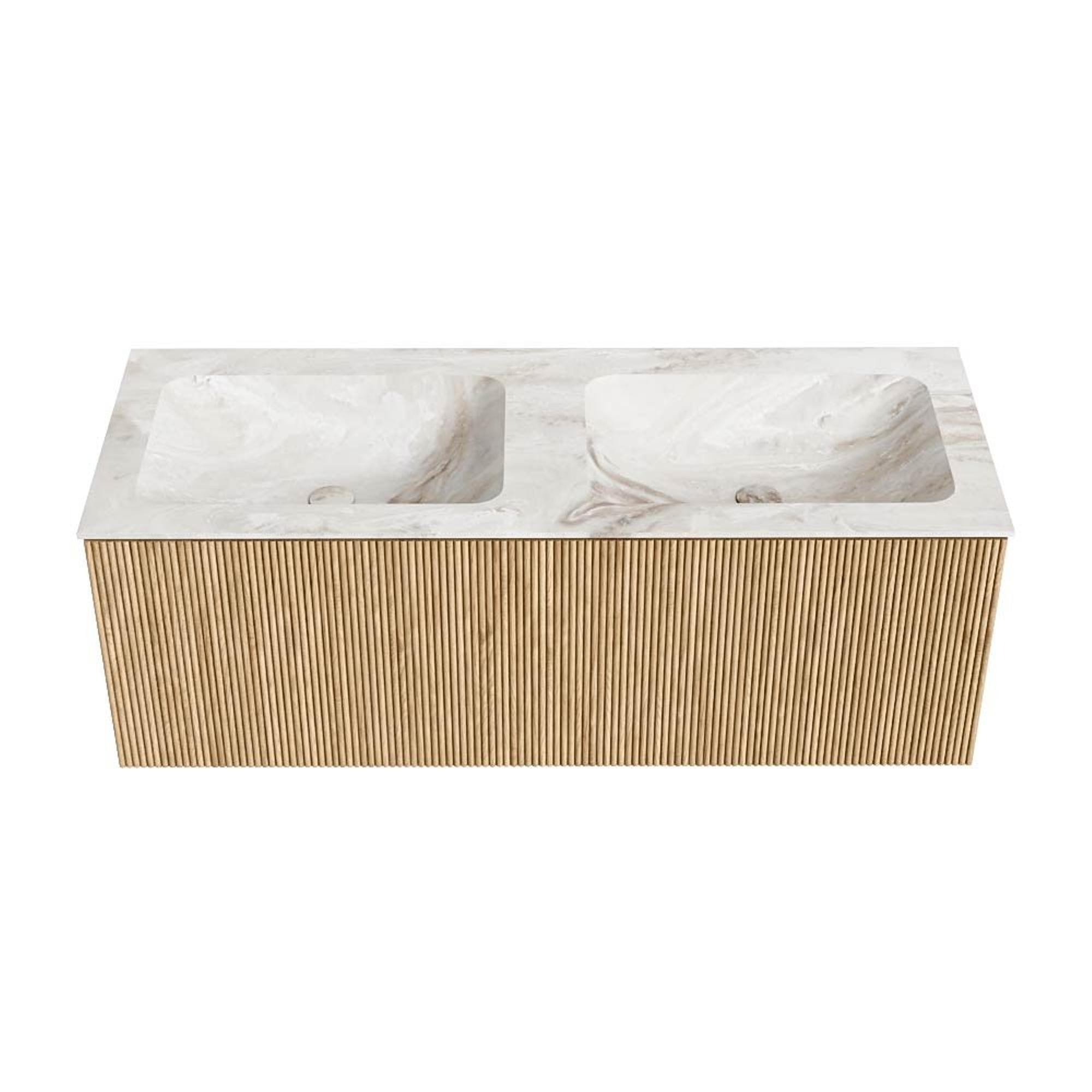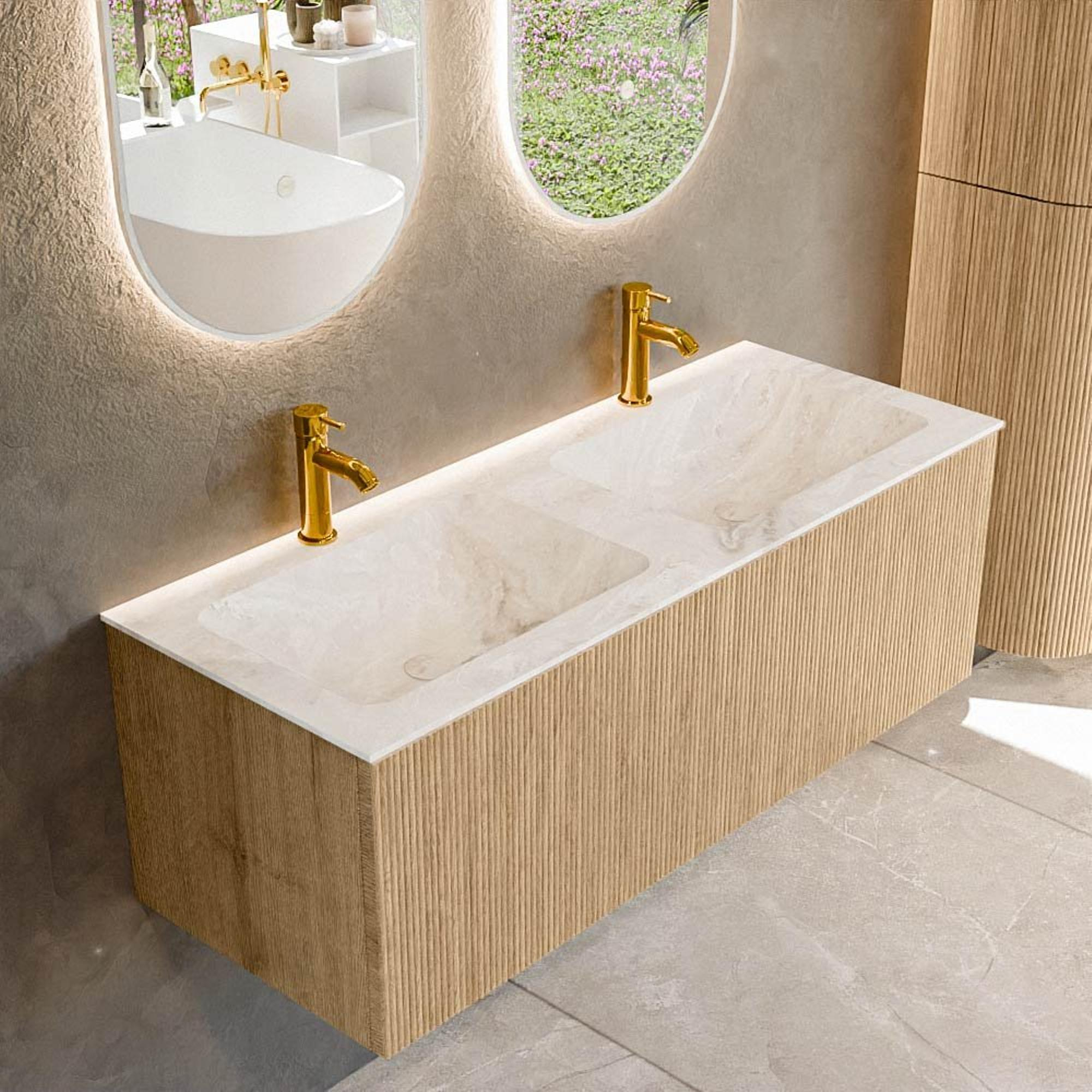 MONDIAZ KURVE-DLUX 120cm badmeubel kleur Oak met 1 lade. Wastafel LEAF dubbel 2 kraangaten kleur Frappe.
