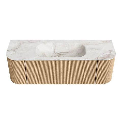 MONDIAZ KURVE-DLUX 140cm badmeubel met module 25 Len R kleur Oak met 1 lade en 2 deuren. Wastafel BIG SMALL midden 1 kraangat kleur Frappe.