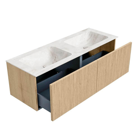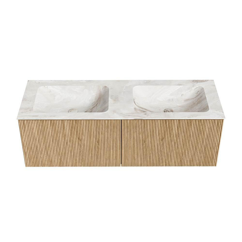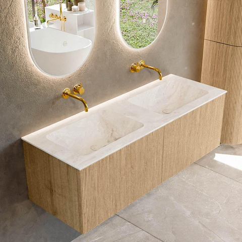 MONDIAZ KURVE-DLUX 130cm badmeubel kleur Oak met 2 lades. Wastafel LEAF dubbel zonder kraangat kleur Frappe.