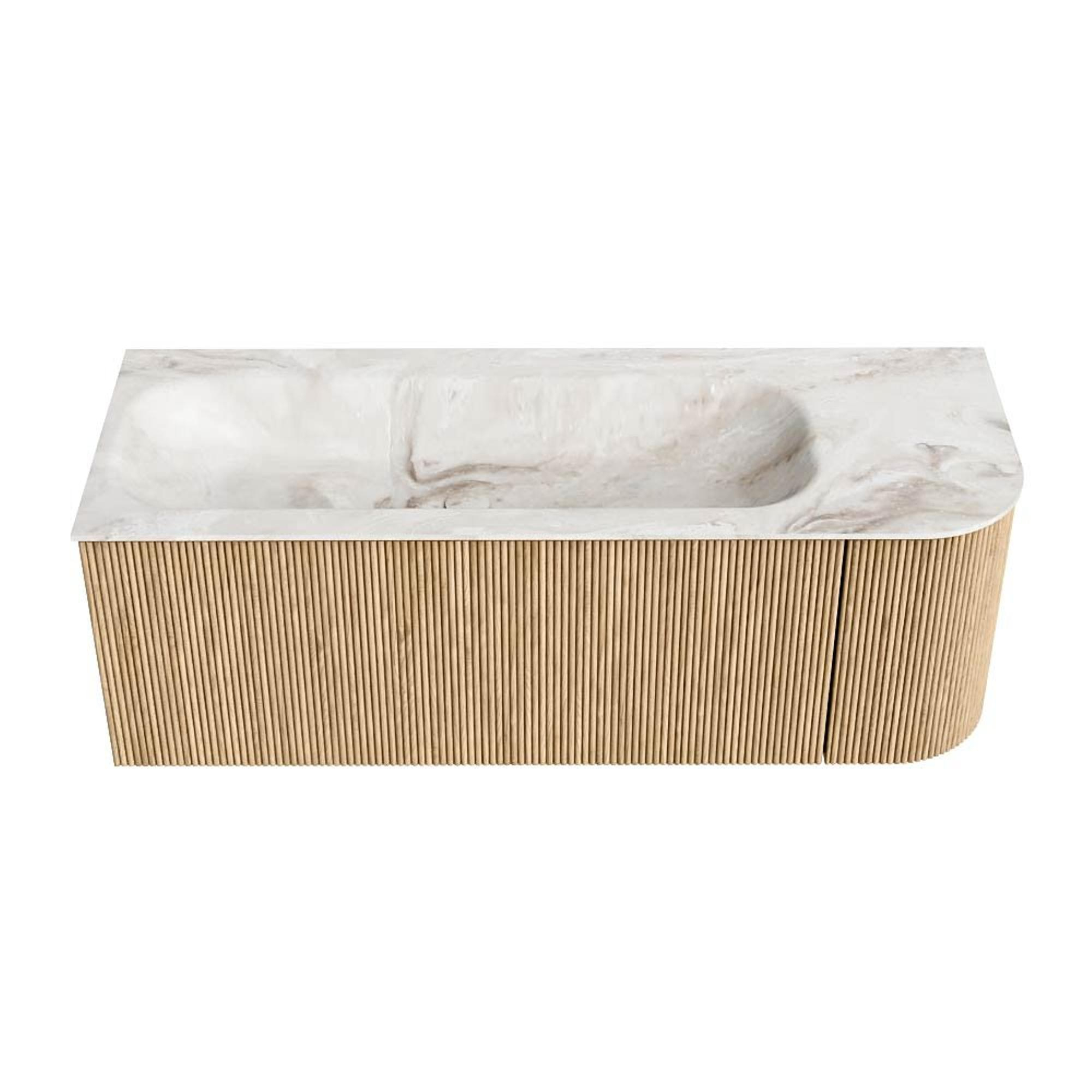 MONDIAZ KURVE-DLUX 125cm badmeubel met module 25 R kleur Oak met 1 lade en 1 deur. Wastafel BIG MEDIUM links zonder kraangat kleur Frappe.