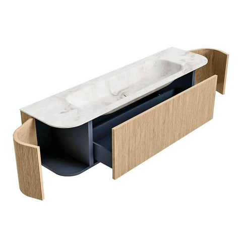Het ultieme badmeubel dat je badkamer transformeert tot een oase van verfijning. Met zijn halfronde, verticale stroken van massief eiken, verkrijgbaar in de kleuren Oak en Walnut, straalt KURVE vakmanschap uit in elk detail. De zachte rondingen en slim ontworpen deurtjes, elk 40cm hoog, nodigen uit tot gebruik, terwijl de ruimte binnenin optimaal benut wordt dankzij de royale lade van dezelfde hoogte.