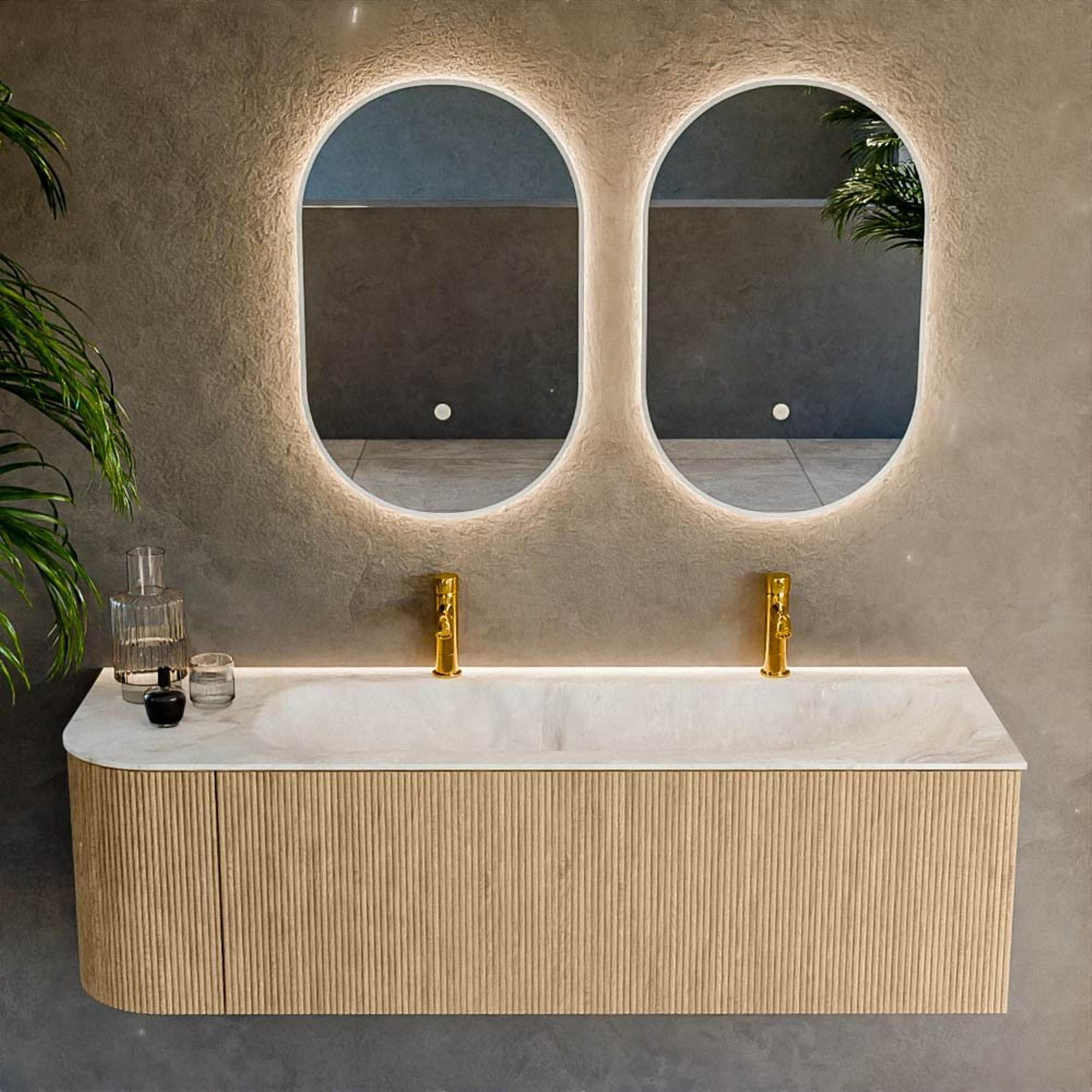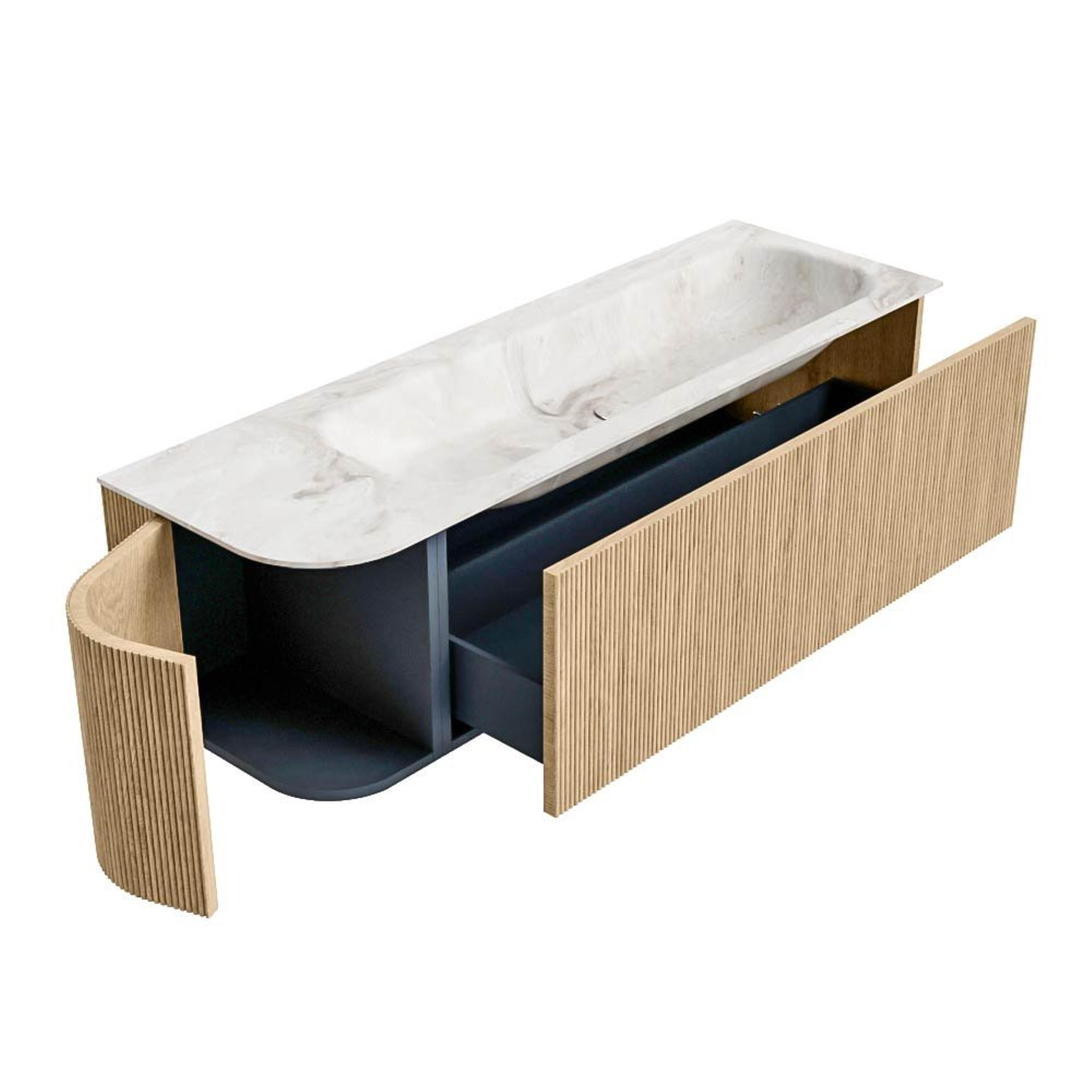 Het ultieme badmeubel dat je badkamer transformeert tot een oase van verfijning. Met zijn halfronde, verticale stroken van massief eiken, verkrijgbaar in de kleuren Oak en Walnut, straalt KURVE vakmanschap uit in elk detail. De zachte rondingen en slim ontworpen deurtjes, elk 40cm hoog, nodigen uit tot gebruik, terwijl de ruimte binnenin optimaal benut wordt dankzij de royale lade van dezelfde hoogte.