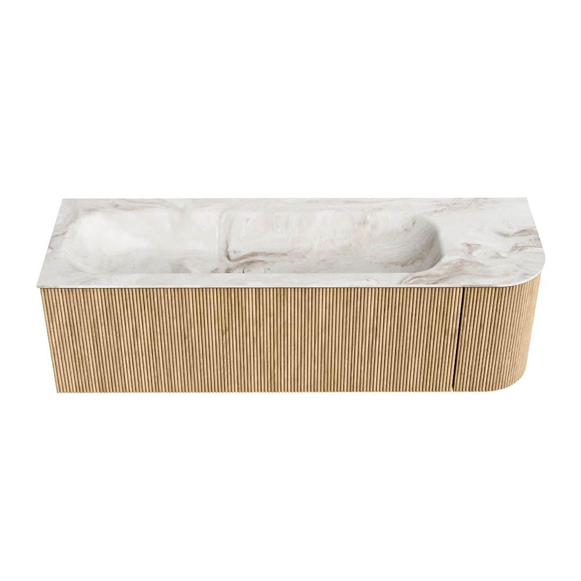 MONDIAZ KURVE-DLUX 145cm badmeubel met module 25 R kleur Oak met 1 lade en 1 deur. Wastafel BIG LARGE links 2 kraangaten kleur Frappe.