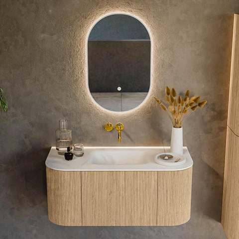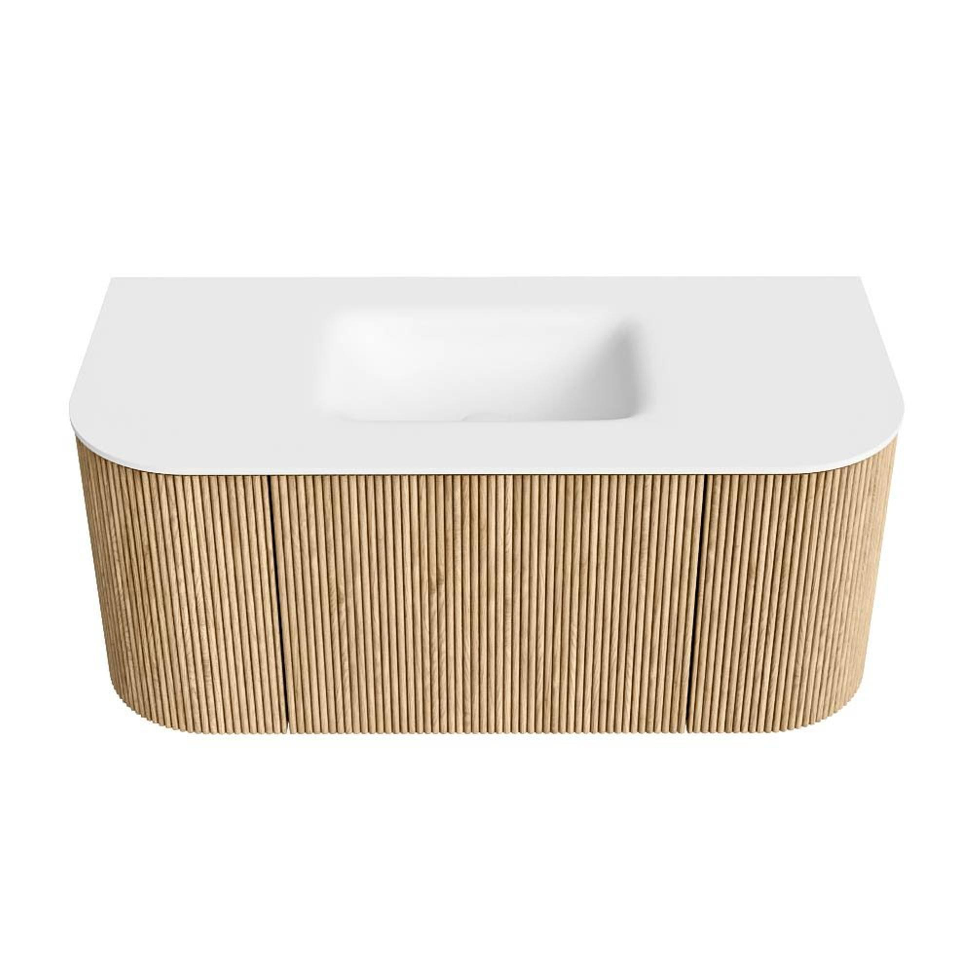 MONDIAZ KURVE 100cm badmeubel met module 25 Len R kleur Oak met 1 lade en 2 deuren. Wastafel GRUNNE midden zonder kraangat Talc.