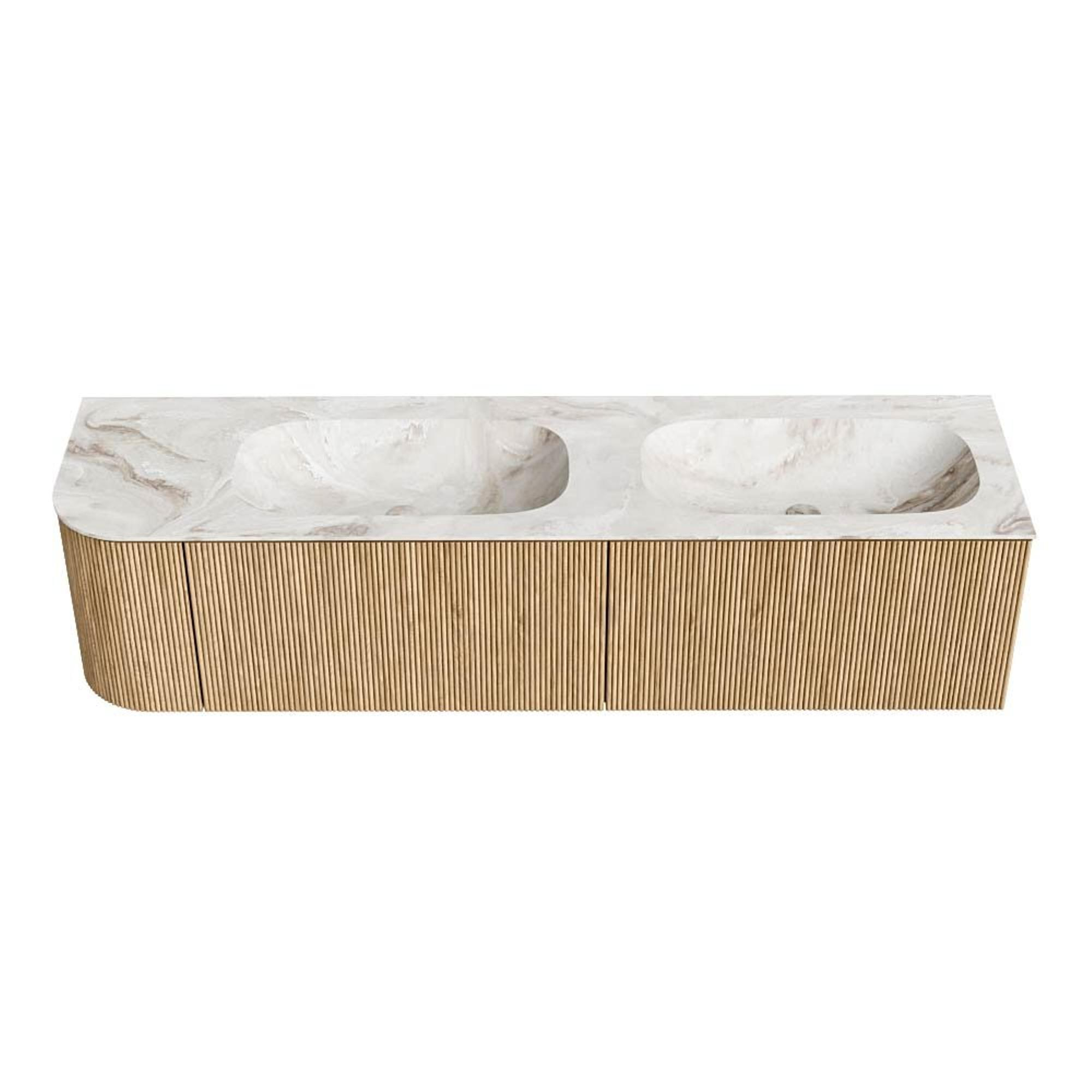 MONDIAZ KURVE-DLUX 175cm badmeubel met module 25 L kleur Oak met 2 lades en 1 deur. Wastafel STOR SMALL dubbel / rechts 2 kraangaten kleur Frappe.