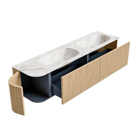 Het ultieme badmeubel dat je badkamer transformeert tot een oase van verfijning. Met zijn halfronde, verticale stroken van massief eiken, verkrijgbaar in de kleuren Oak en Walnut, straalt KURVE vakmanschap uit in elk detail. De zachte rondingen en slim ontworpen deurtjes, elk 40cm hoog, nodigen uit tot gebruik, terwijl de ruimte binnenin optimaal benut wordt dankzij de royale lade van dezelfde hoogte.