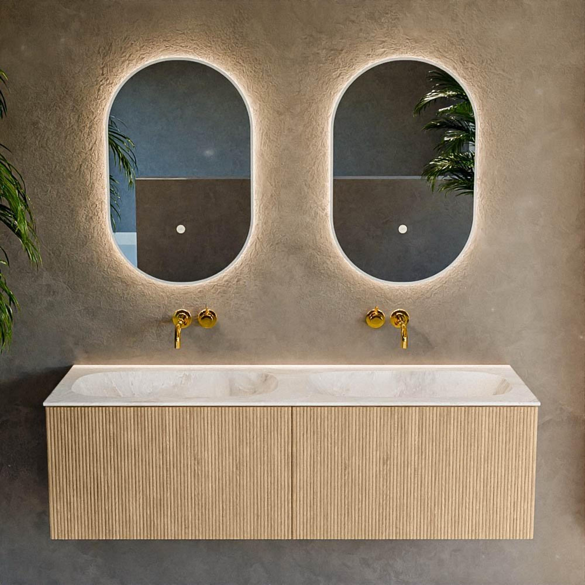 MONDIAZ KURVE-DLUX 140cm badmeubel kleur Oak met 2 lades. Wastafel STOR SMALL dubbel zonder kraangat kleur Frappe.