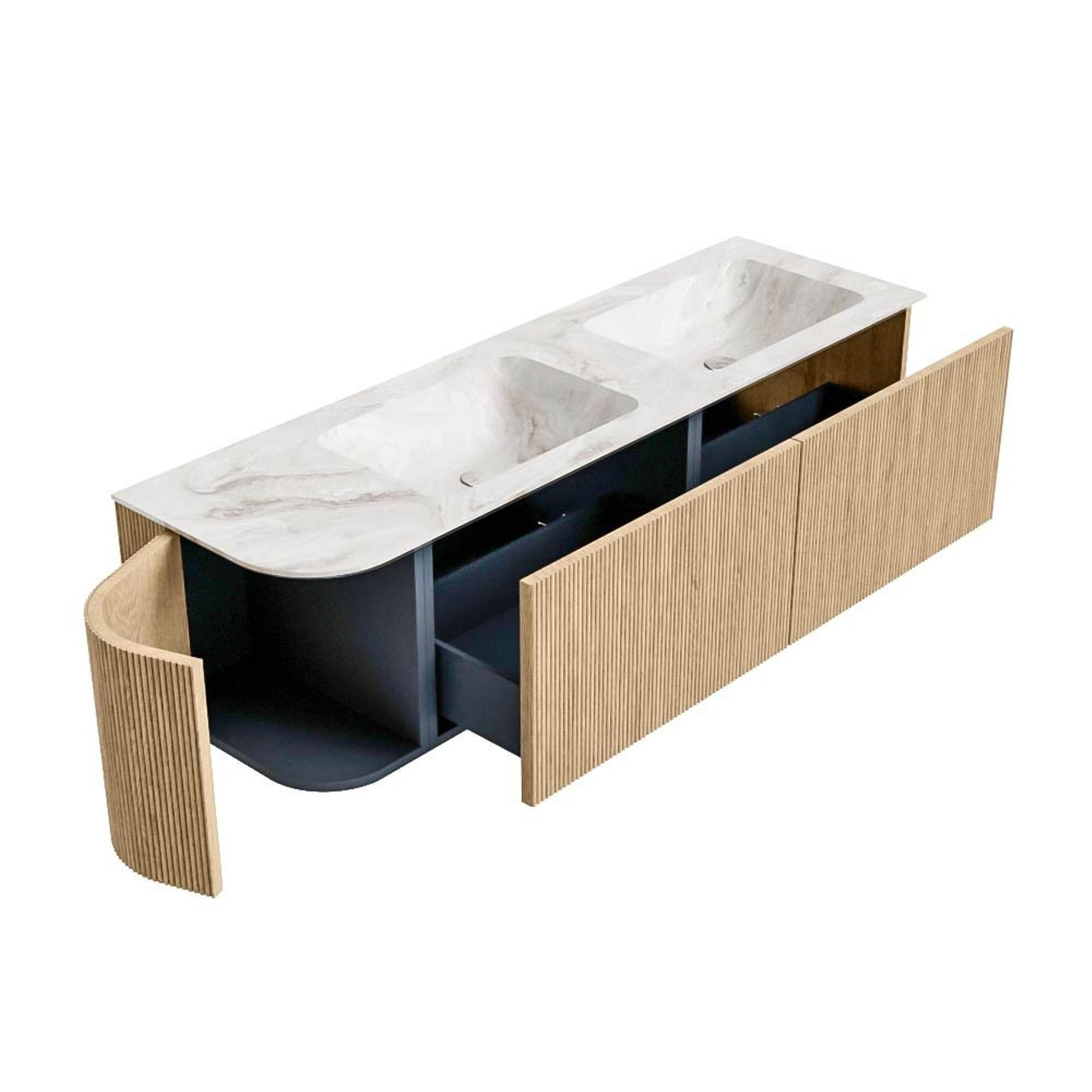 Het ultieme badmeubel dat je badkamer transformeert tot een oase van verfijning. Met zijn halfronde, verticale stroken van massief eiken, verkrijgbaar in de kleuren Oak en Walnut, straalt KURVE vakmanschap uit in elk detail. De zachte rondingen en slim ontworpen deurtjes, elk 40cm hoog, nodigen uit tot gebruik, terwijl de ruimte binnenin optimaal benut wordt dankzij de royale lade van dezelfde hoogte.
