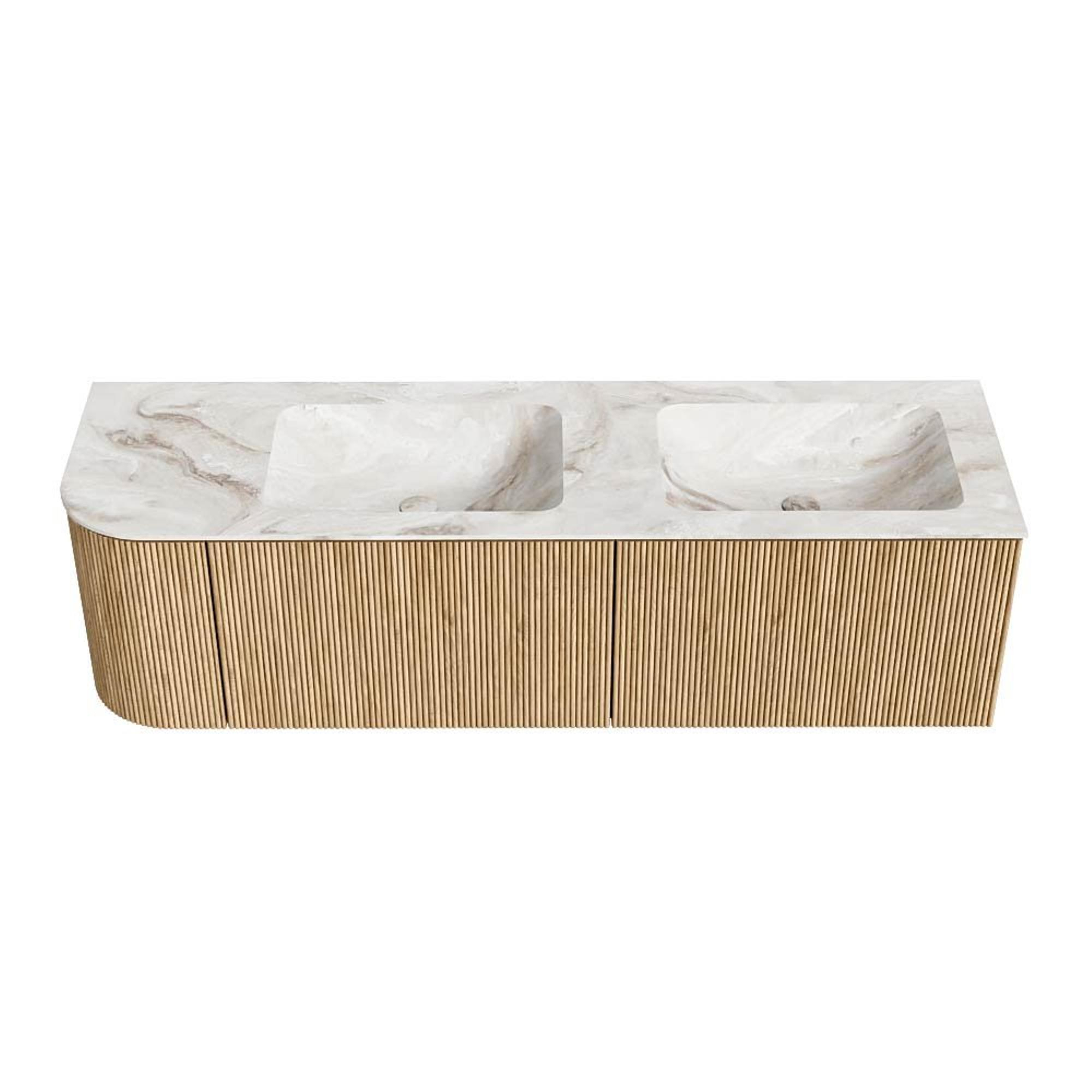 MONDIAZ KURVE-DLUX 155cm badmeubel met module 25 L kleur Oak met 2 lades en 1 deur. Wastafel LEAF dubbel / rechts zonder kraangat kleur Frappe.