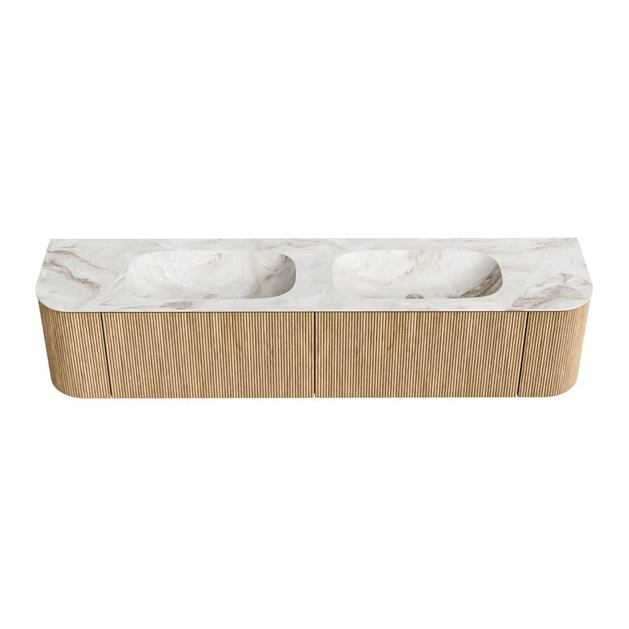 MONDIAZ KURVE-DLUX 200cm badmeubel met module 25 Len R kleur Oak met 2 lades en 2 deuren. Wastafel STOR SMALL dubbel 2 kraangaten kleur Frappe.