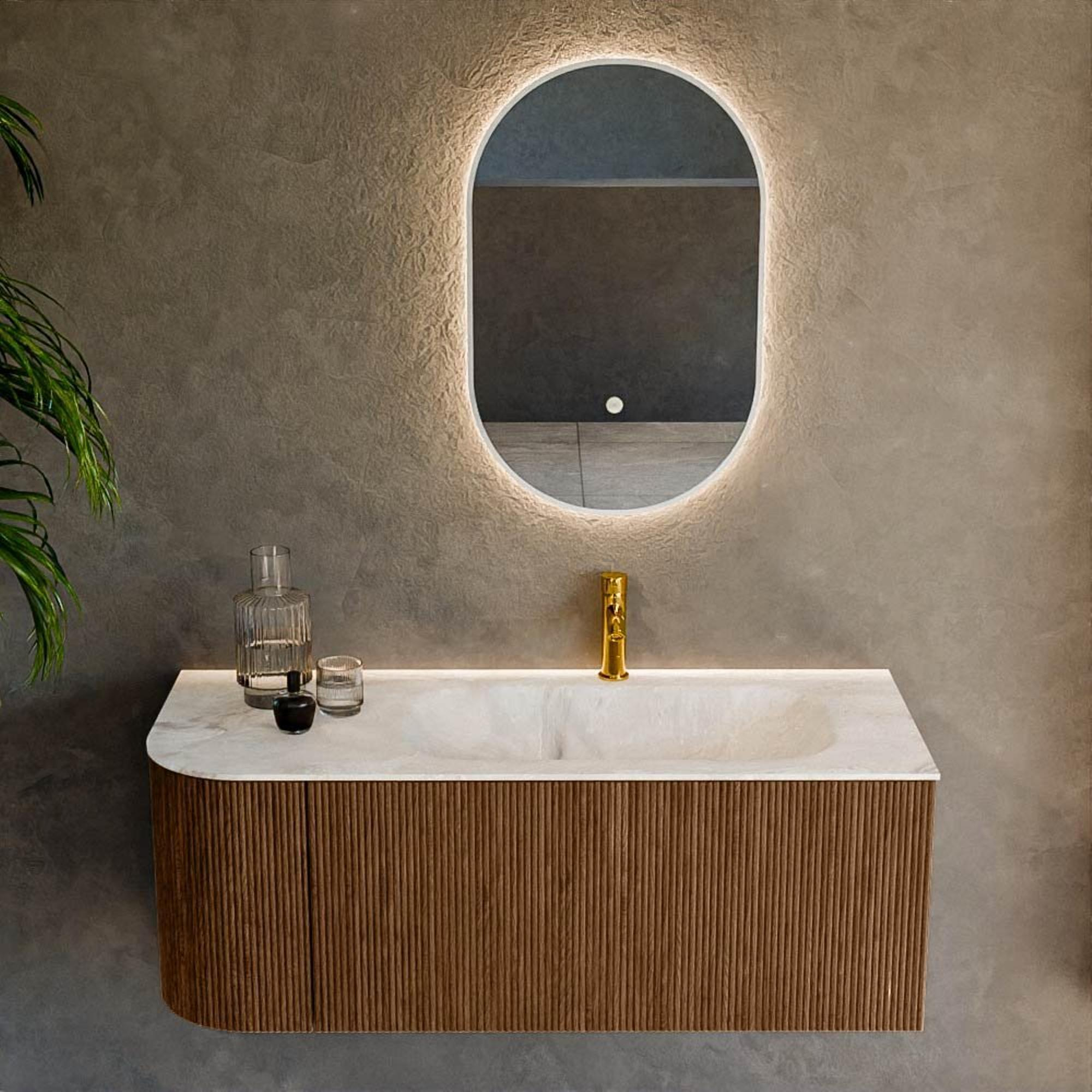 Het ultieme badmeubel dat je badkamer transformeert tot een oase van verfijning. Met zijn halfronde, verticale stroken van massief eiken, verkrijgbaar in de kleuren Oak en Walnut, straalt KURVE vakmanschap uit in elk detail. De zachte rondingen en slim ontworpen deurtjes, elk 40cm hoog, nodigen uit tot gebruik, terwijl de ruimte binnenin optimaal benut wordt dankzij de royale lade van dezelfde hoogte.