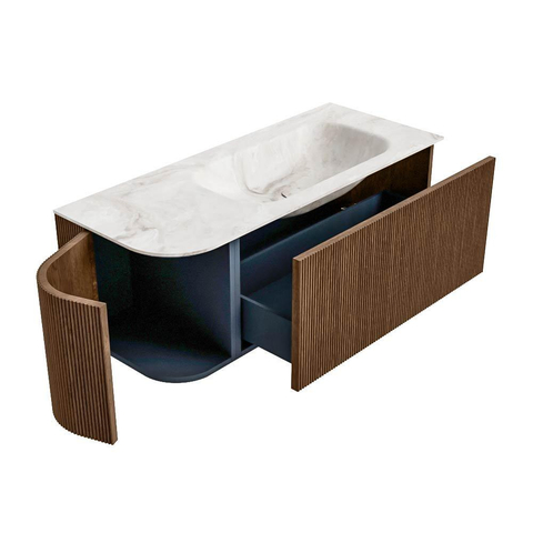 MONDIAZ KURVE-DLUX 115cm badmeubel met module 25 L kleur Walnut met 1 lade en 1 deur. Wastafel BIG SMALL rechts 1 kraangat kleur Frappe.