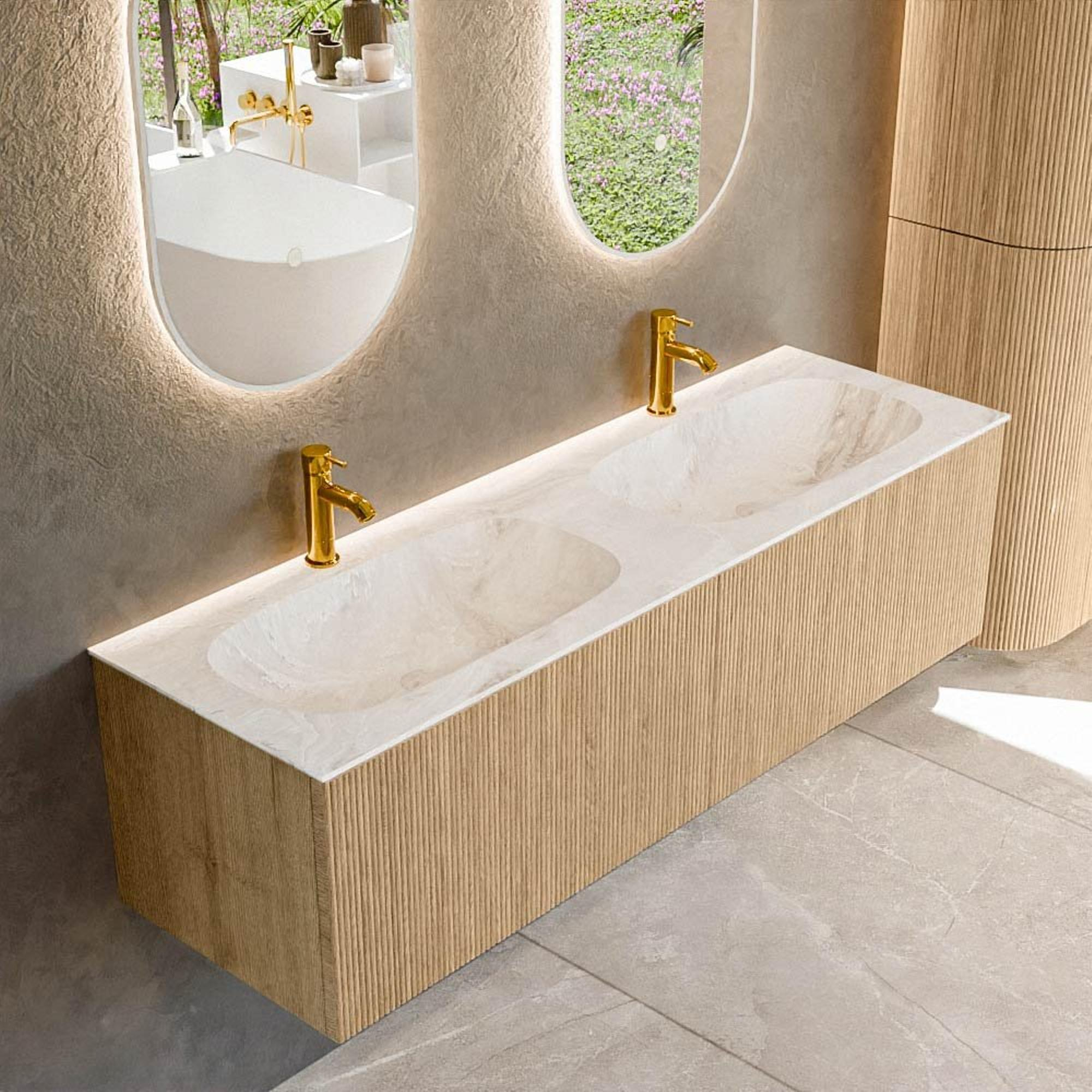 MONDIAZ KURVE-DLUX 150cm badmeubel kleur Oak met 2 lades. Wastafel STOR SMALL dubbel 2 kraangaten kleur Frappe.